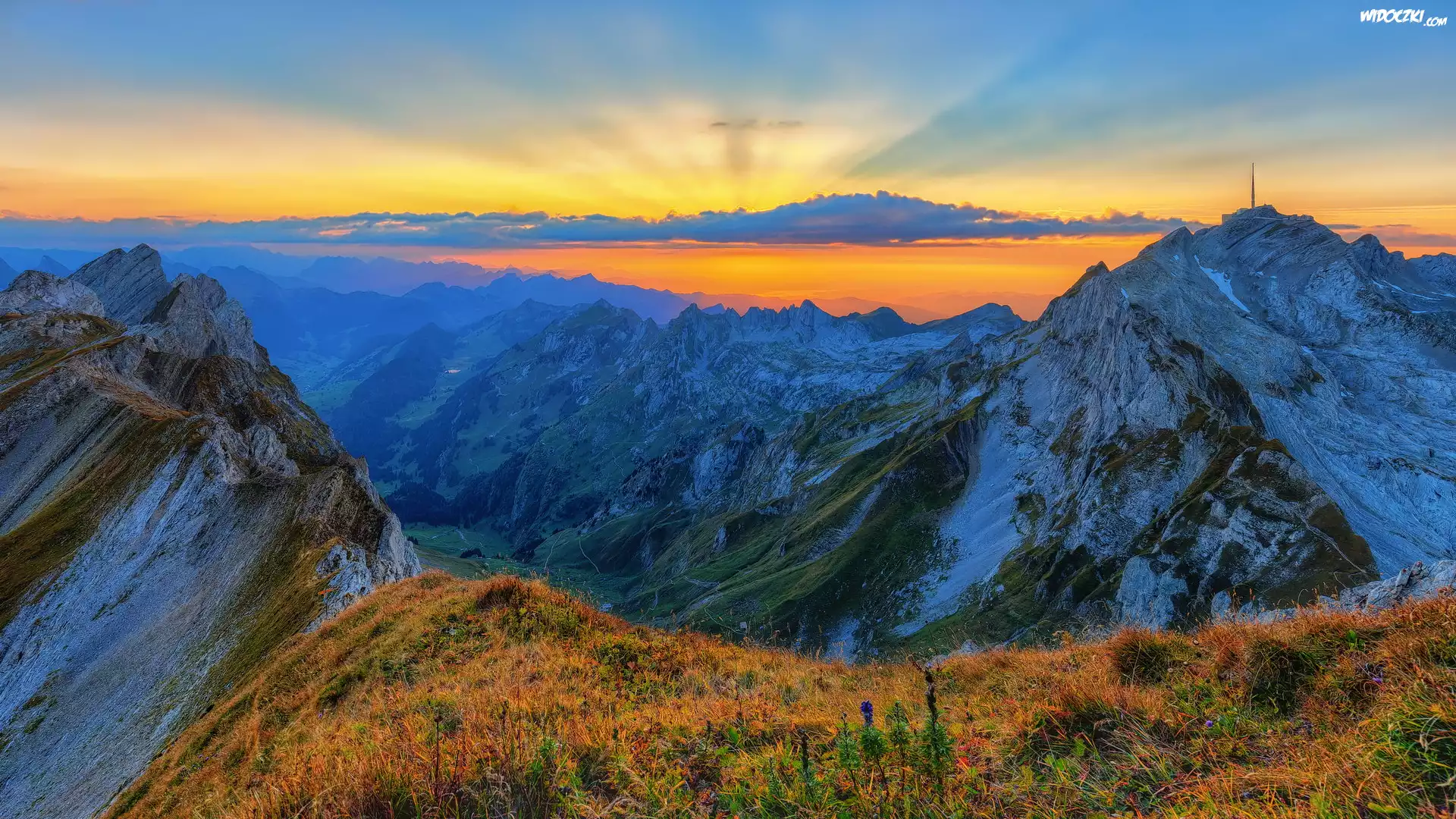Zdjęcia, Góry, Alpy Zachodnie, Prealpy Szwajcarskie, Szczyt Altmann, Zachód słońca, Dolina, Szwajcaria