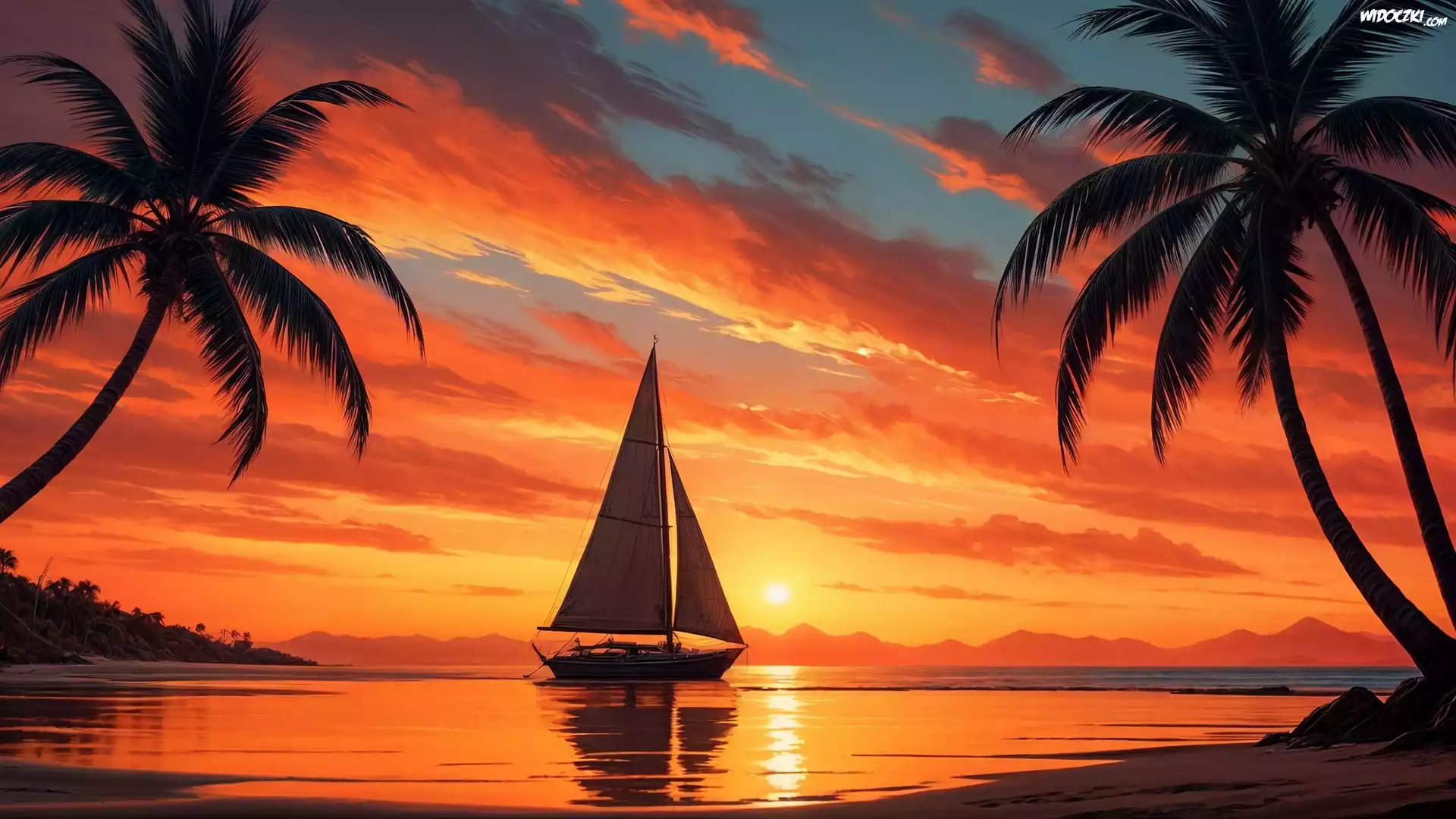 Morze, Zachód słońca, Żaglówka, Palmy, Plaża, Grafika