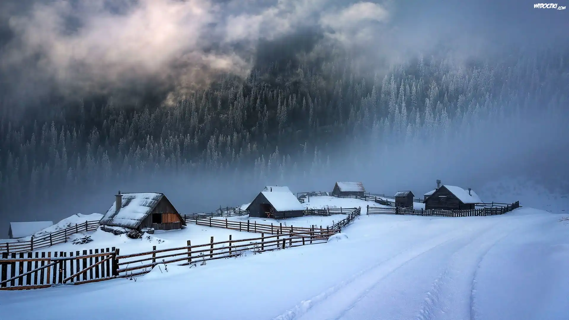 Zdjęcia, Drewniane, Zagrody, Góry, Lasy, Mgła, Droga, Zima