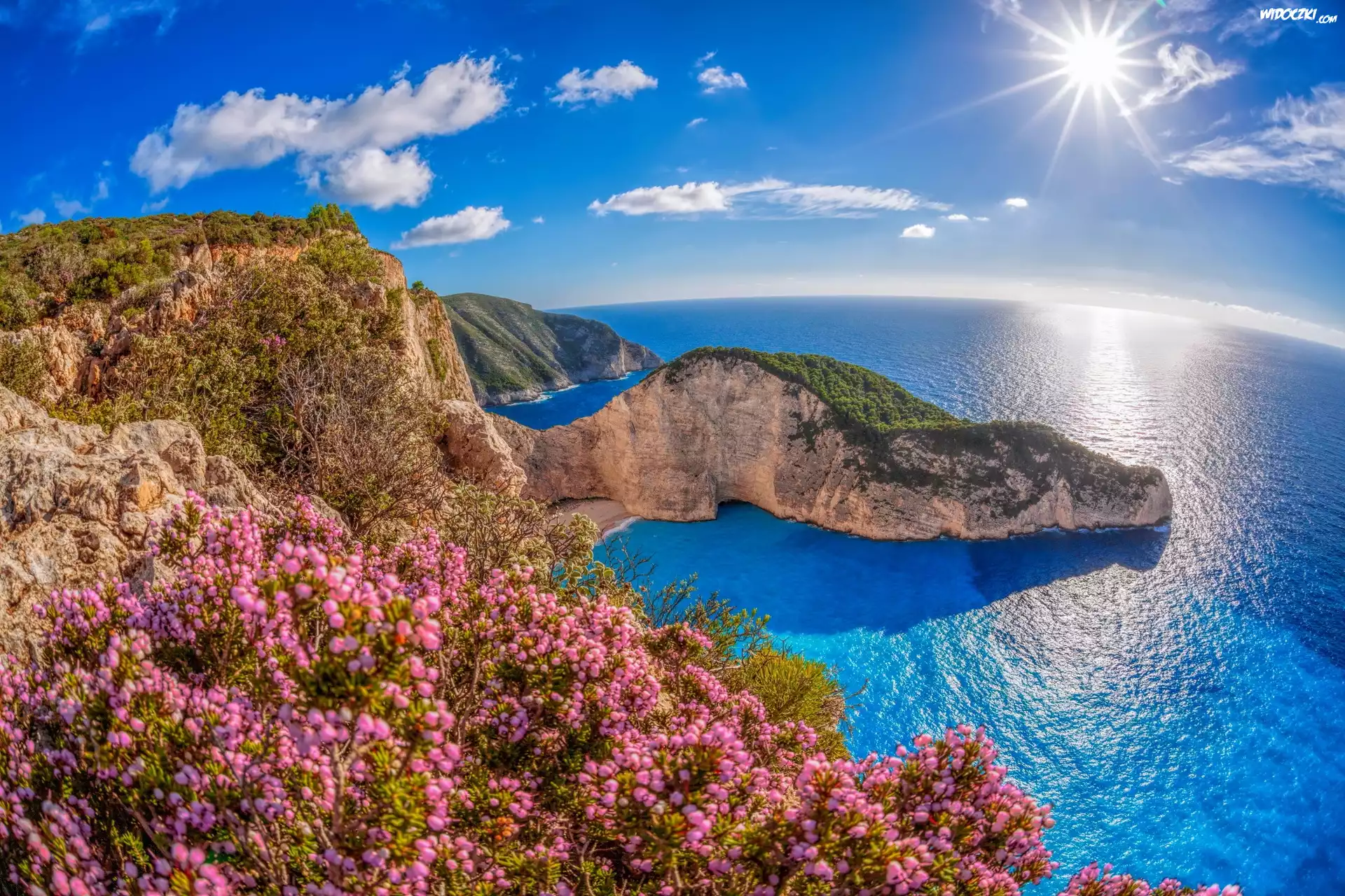 Zdjęcia, Grecja, Wyspa Zakintos, Plaża Nawajo, Promienie słońca, Zatoka, Morze Jońskie, Góry