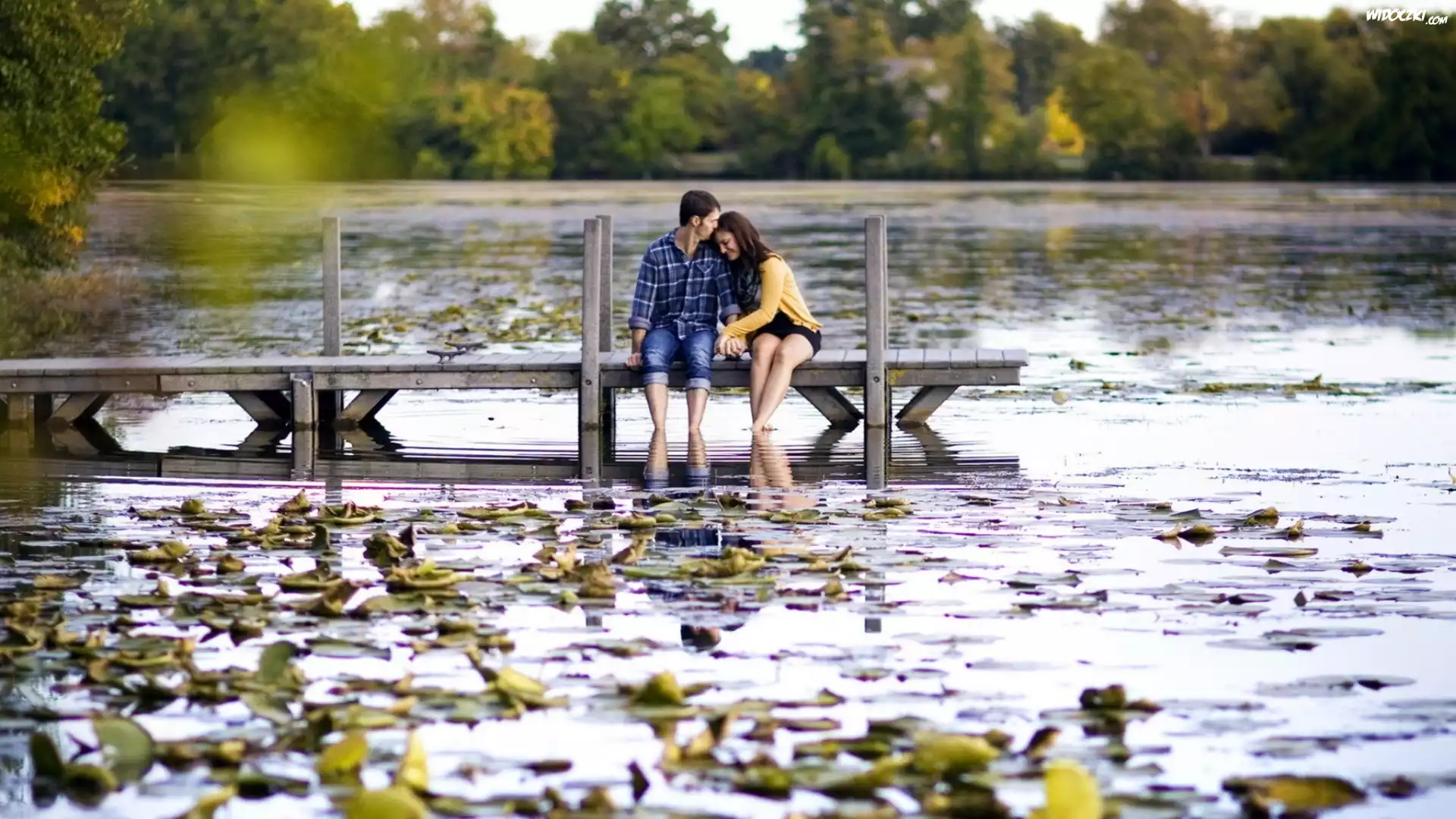 Zakochana, Para, Rzeka, Liście, Drzewa