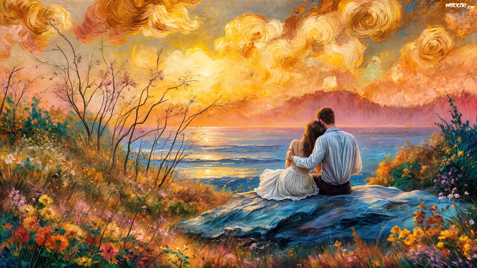 Kobieta, Mężczyzna, Para, Zakochani, Morze, Roślinność, Grafika