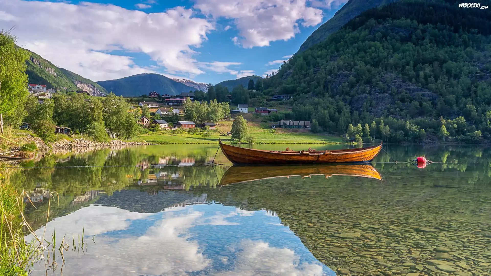 Zdjęcia, Jezioro, Zalesione, Góry, Domy, Łódka, Gmina Luster, Norwegia