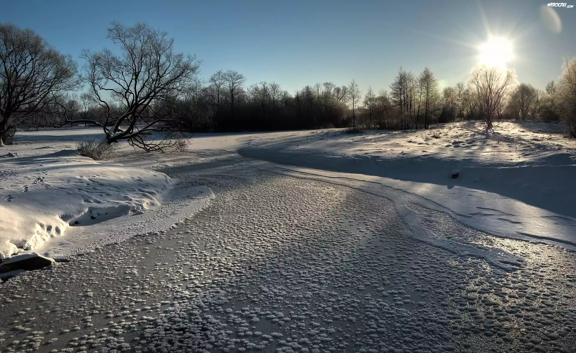 Zamarznięta, Rzeka, Słońce, Niebo, Drzewa