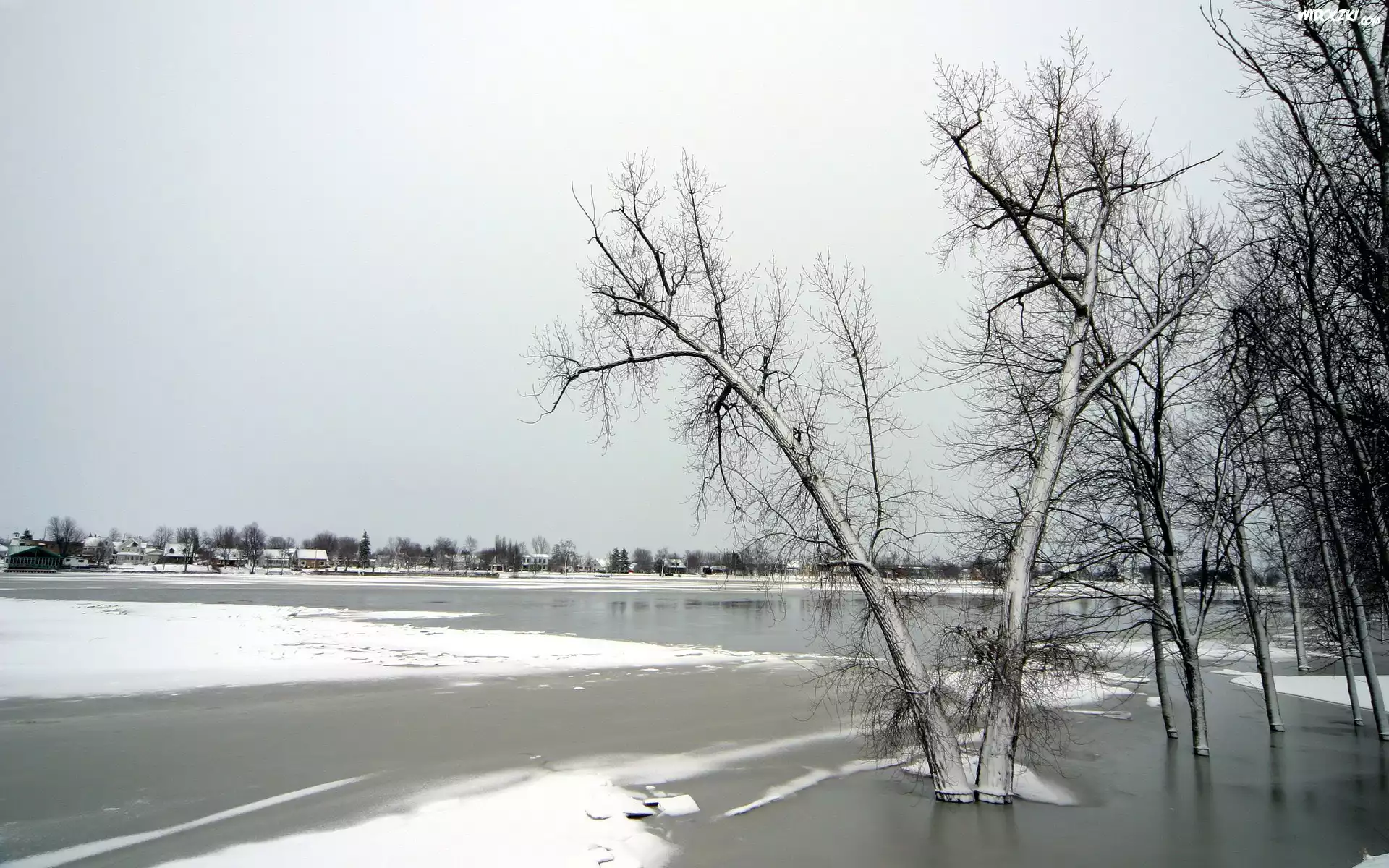 Zdjęcia, Zamarznięte, Jezioro, Drzewa, W, Dali, Domy