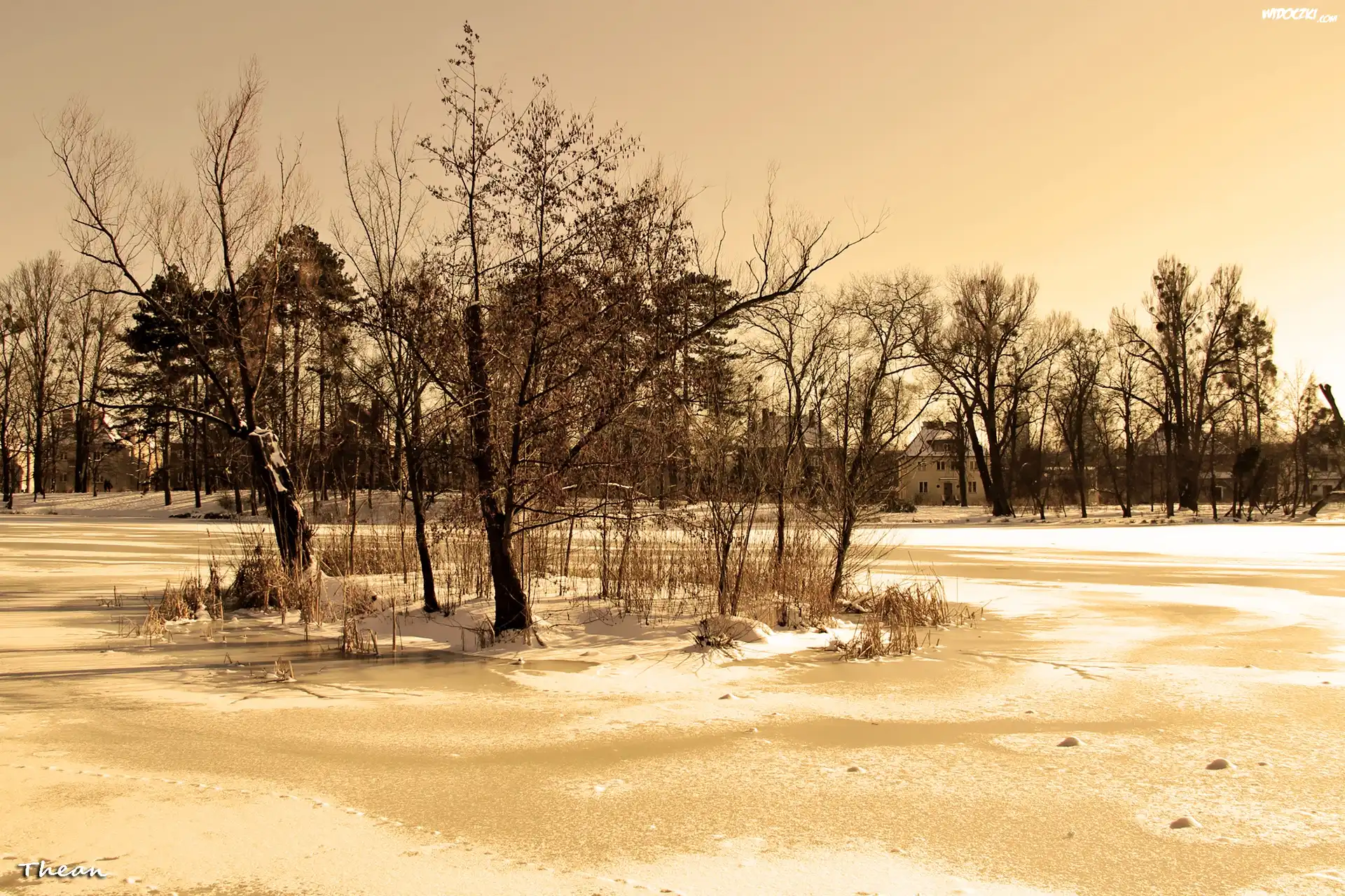 Zdjęcia, Zamarznięte, Jezioro, Drzewa, Zima