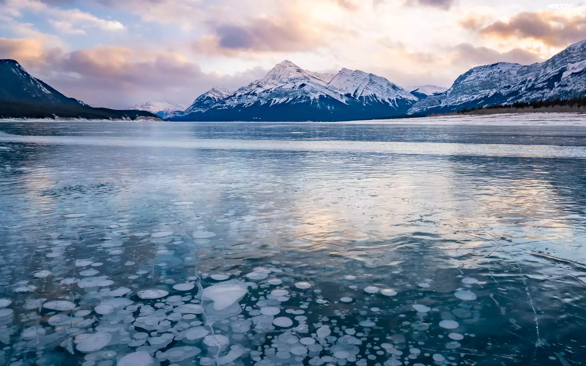 Zdjęcia, Góry, Zamarznięte, Jezioro Abraham, Zachód słońca, Alberta, Kanada
