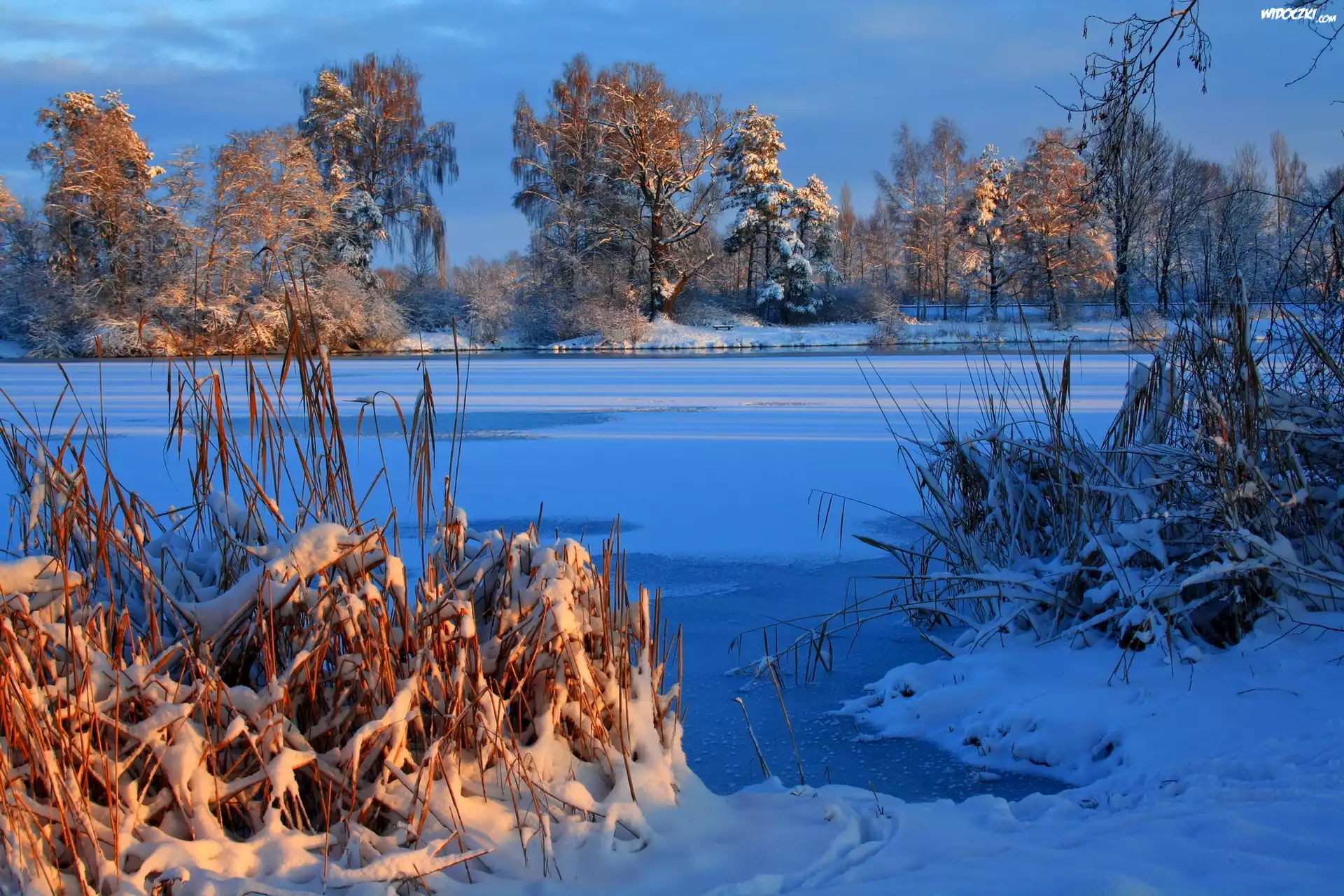 Zamarznięte, Jezioro, Drzewa, Krzewy, Zima