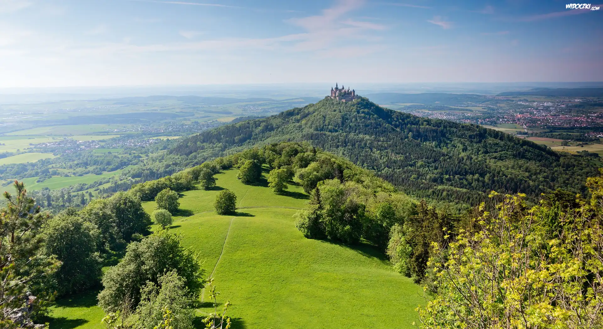 Góra Hohenzollern, Zamek Hohenzollern, Badenia-Wirtembergia, Niemcy, Las, Jesień, Chmury, Wzgórze |