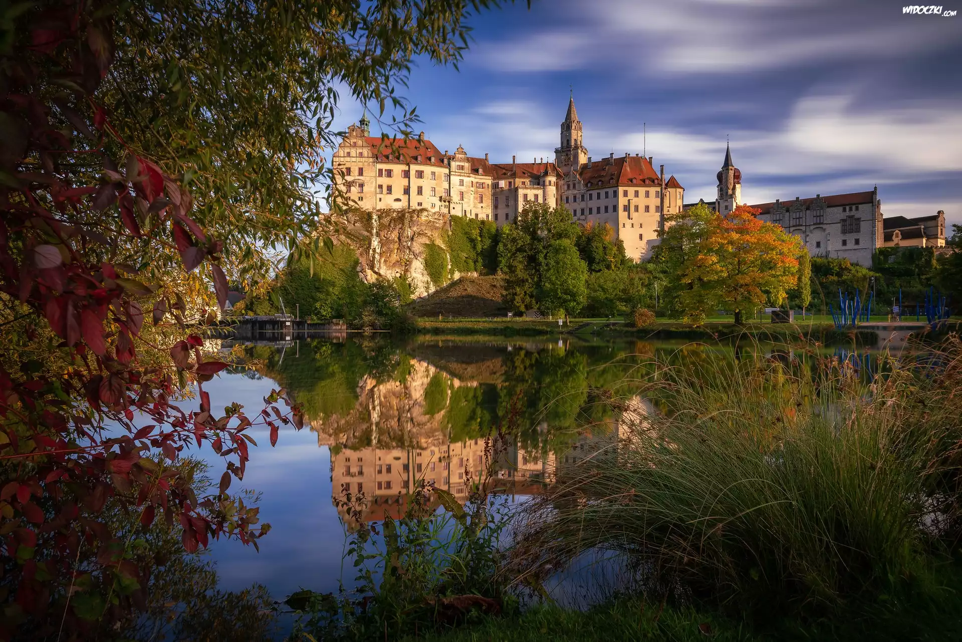 Zdjęcia, Zamek Sigmaringen, Rzeka, Dunaj, Drzewa, Zieleń, Badenia-Wirtembergia, Niemcy