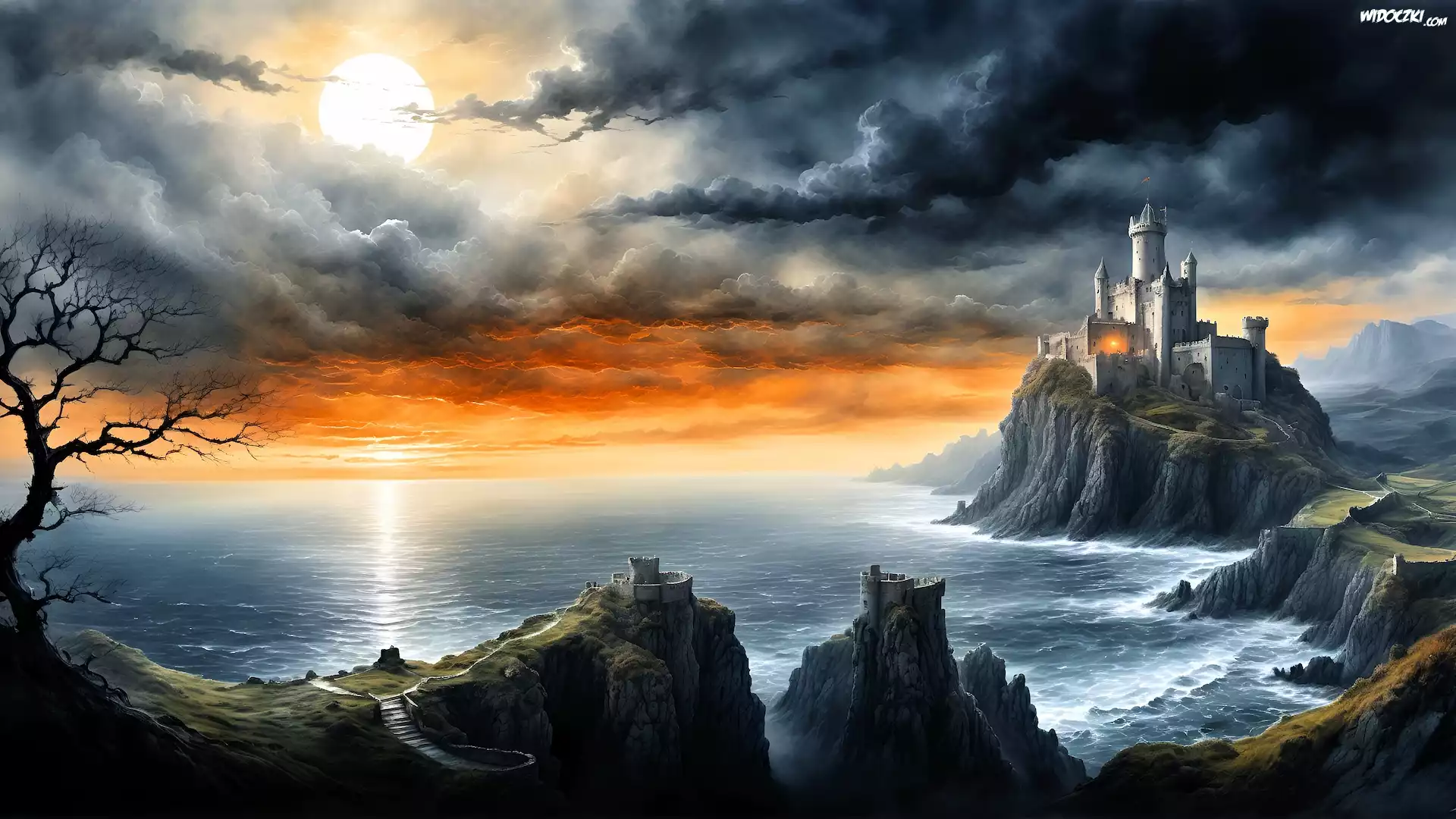Grafika, Morze, Skały, Zamek, Drzewo, Chmury