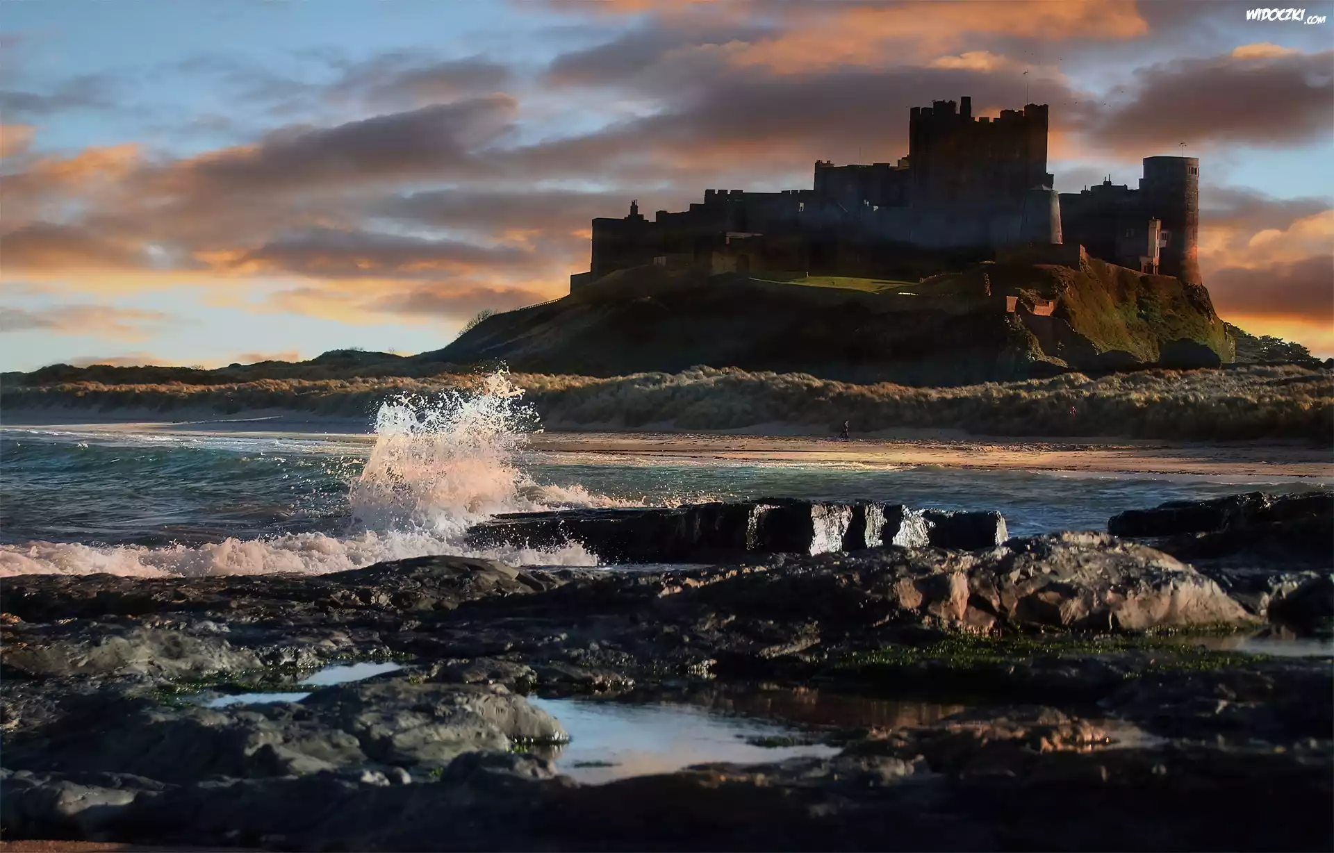 Zdjęcia, Zamek, Skały, Fale, Chmury
