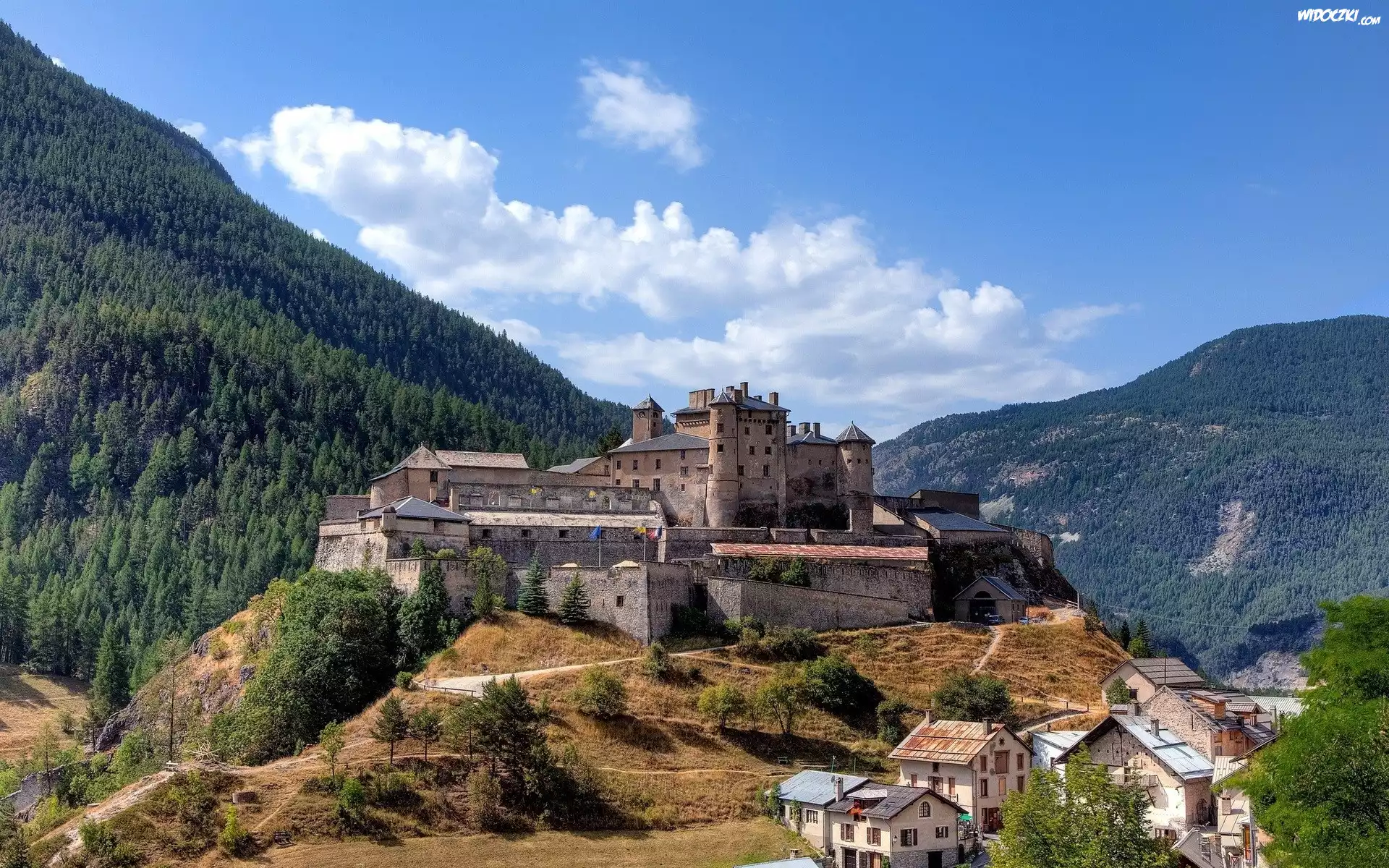 Zamek, Domy, Góry, Lasy, Niebo