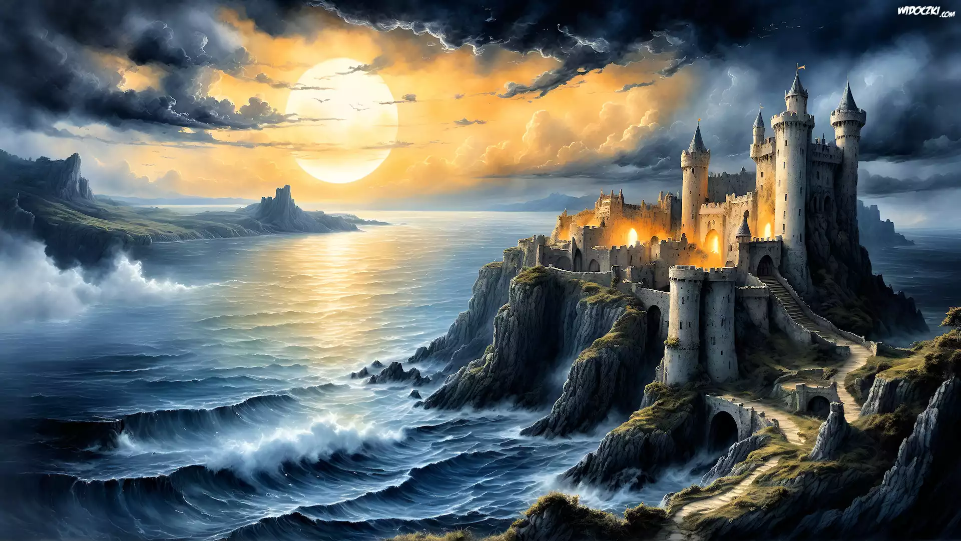 Zdjęcia, Grafika, Morze, Skały, Zamek, Słońce, Chmury, Fantasy