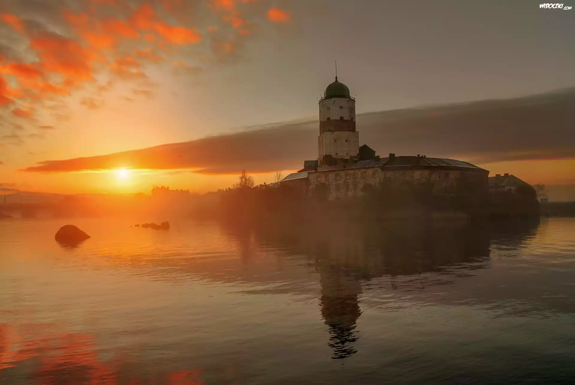 Zamek, Rosja, Jezioro, Wschód, Słońca, Mgła