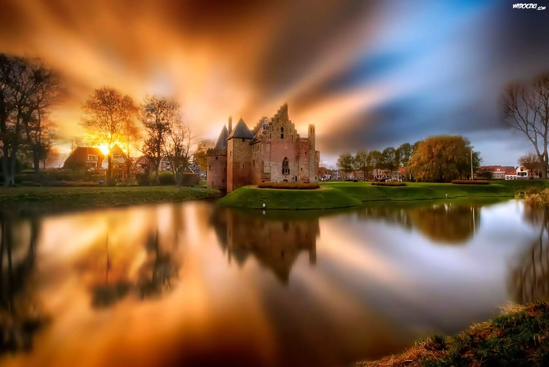 ZdjÄ™cia, Zamek Radboud, Miasto Medemblik, Holandia, Jezioro IJsselmeer, Zachód sÅ‚oÅ„ca