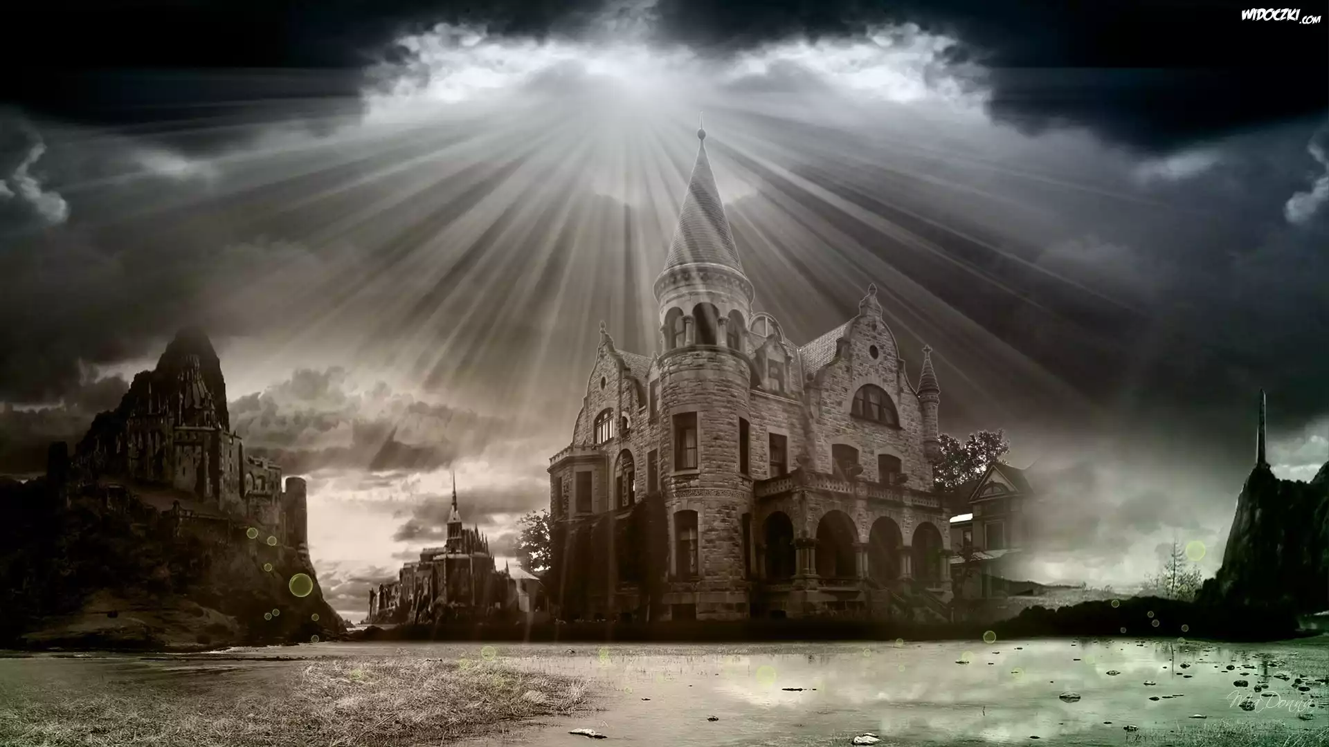 Zdjęcia, Zamek, Chmury, Przebijające, Światło, Art