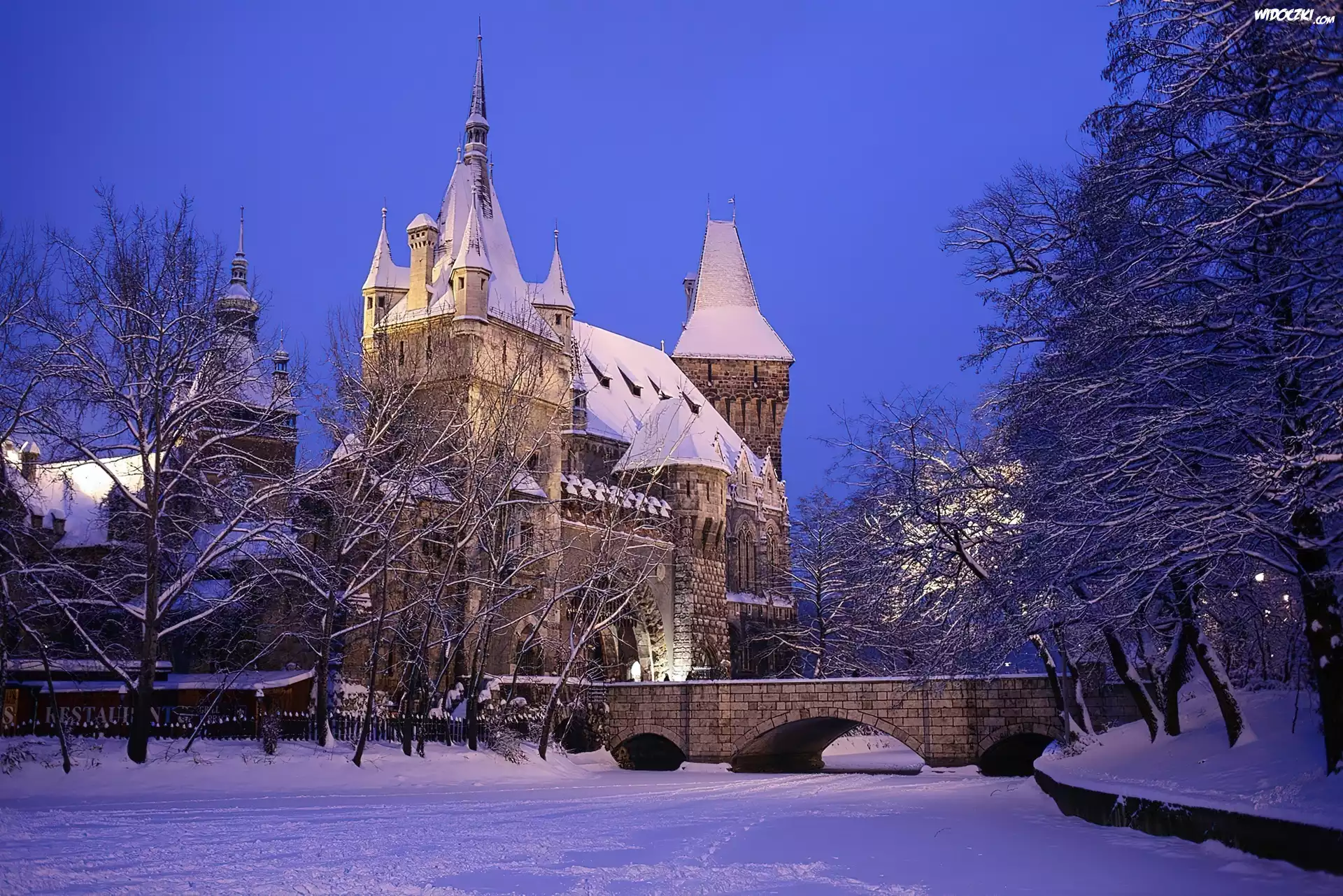 Zdjęcia, Węgry, Budapeszt, Zamek Vajdahunyad, Zima, Mostek