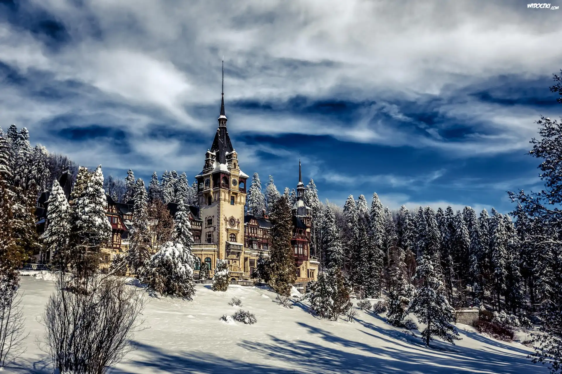 Zdjęcia, Pałac Peles, Castelul Peleş, Miejscowość Sinaia, Rumunia, Zima, Drzewa