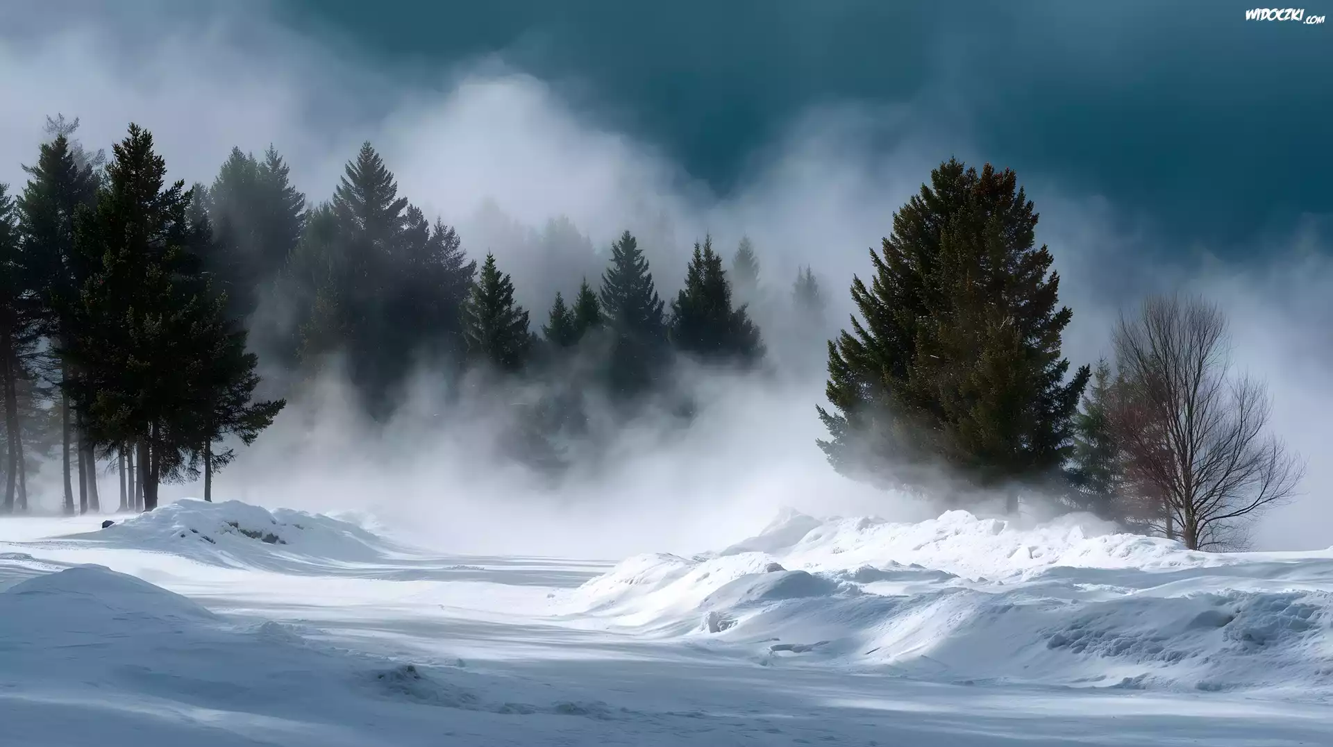 Zdjęcia, Zima, Droga, Drzewa, Zamieć, Grafika AI