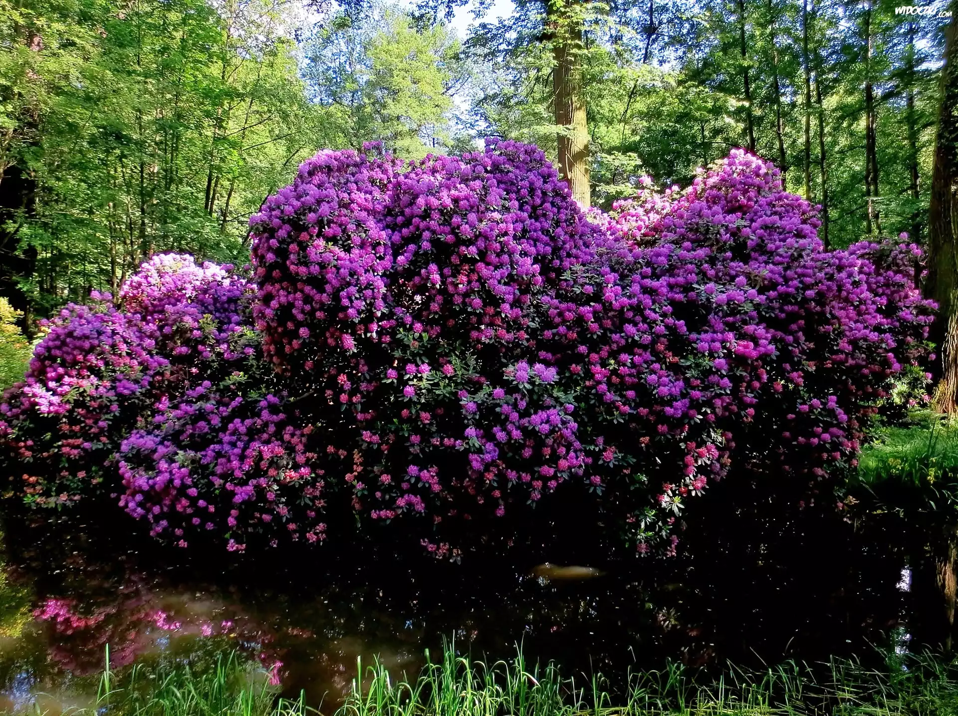 Zdjęcia, Park, Zamkowy, Moszna, Staw, Rododendrony, Przebijające, Światło