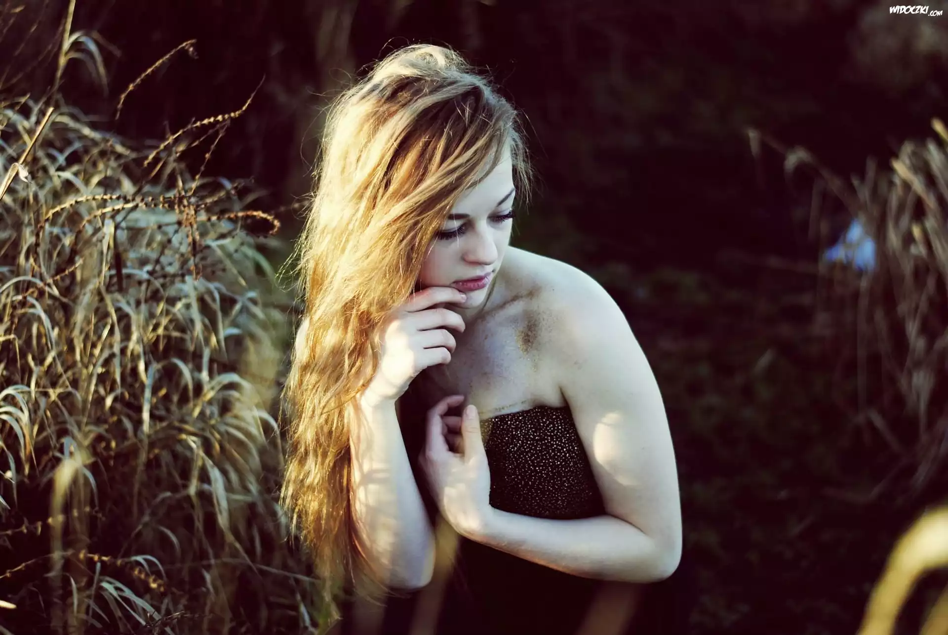 Zdjęcia, Zamyślona ,Kobieta, Blondynka, Łąka