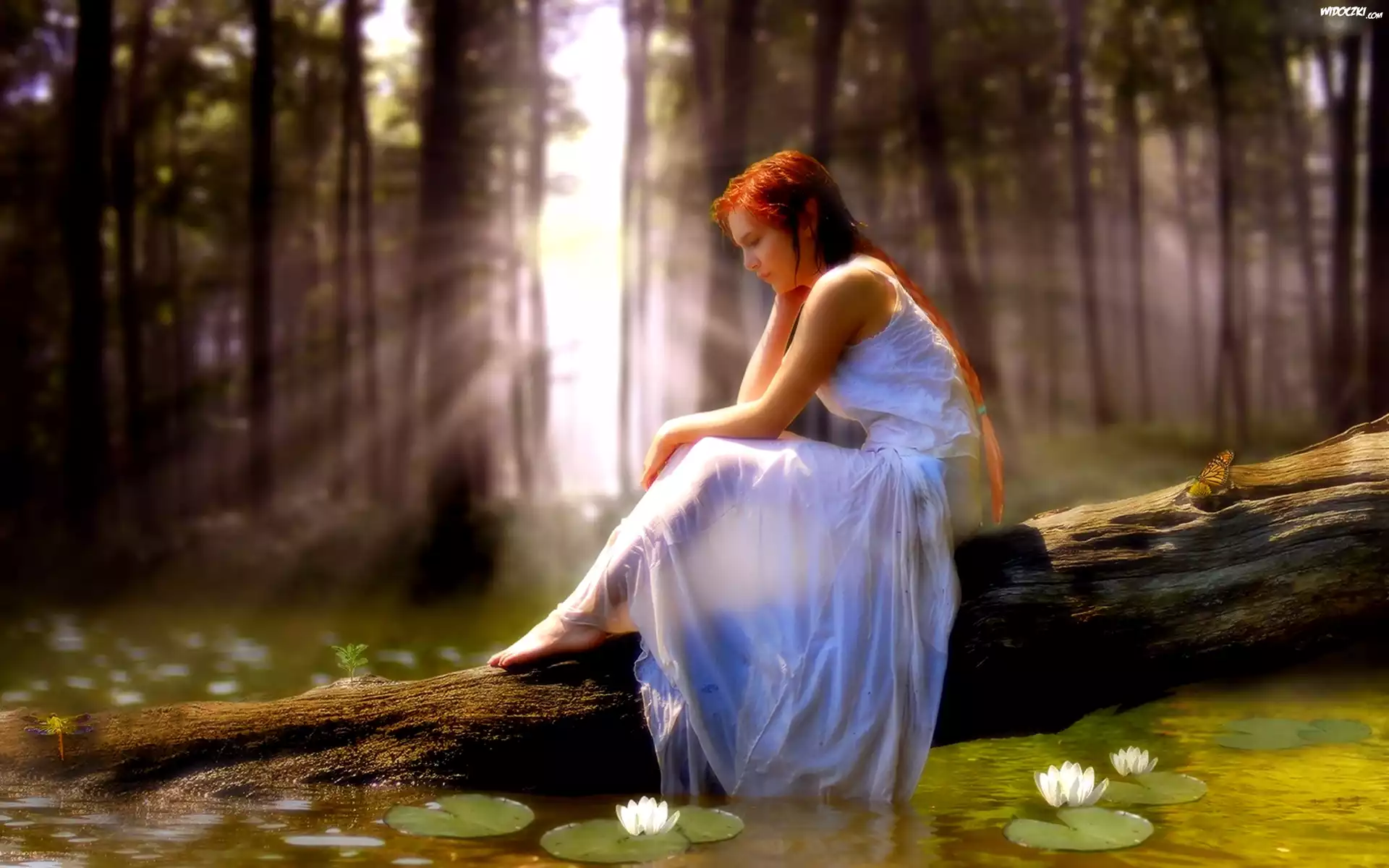 Zamyślona, Dziewczyna, Biała, Sukienka, Las