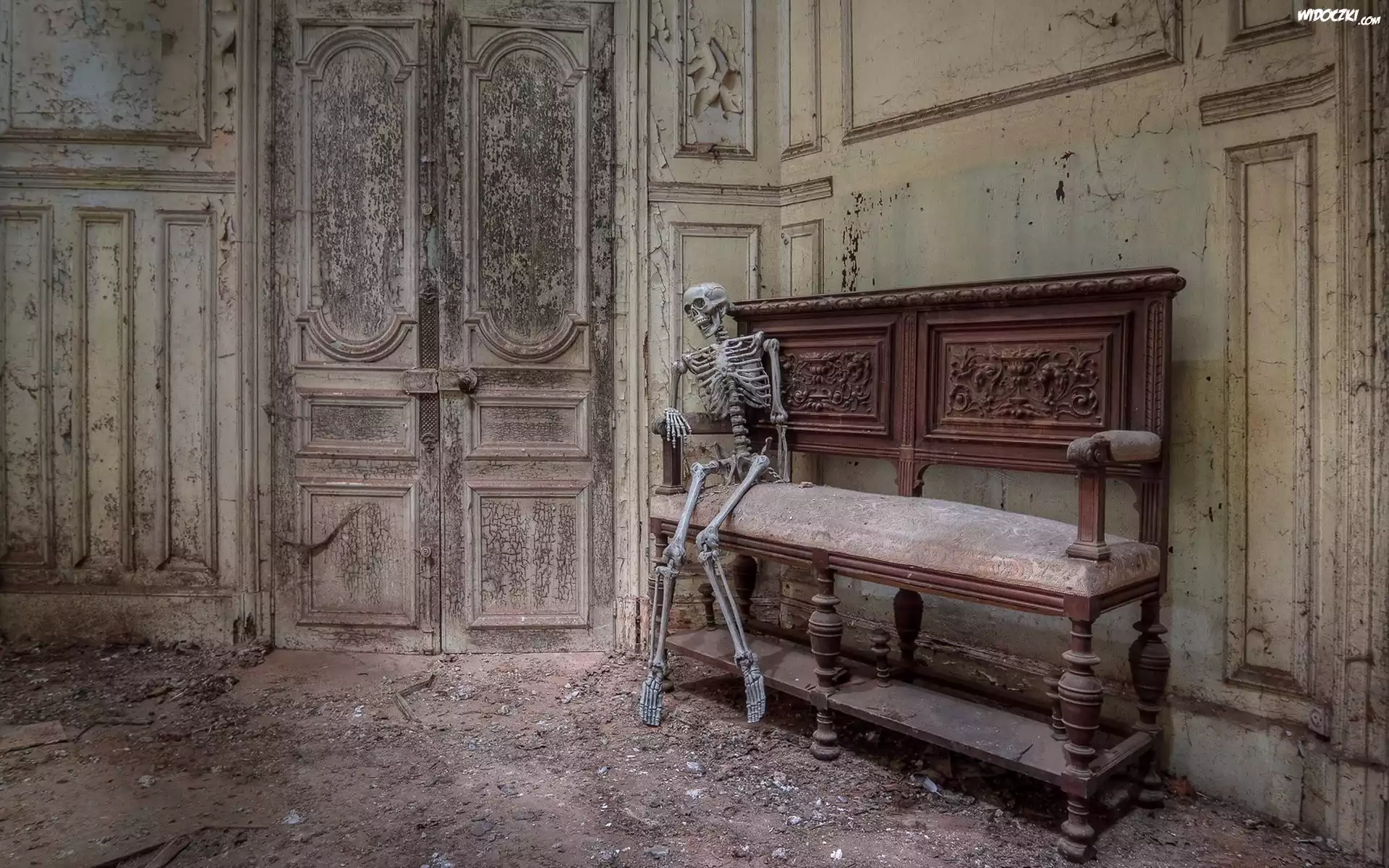 Zdjęcia, Zaniedbane, Wnętrze, Ławka, Szkielet
