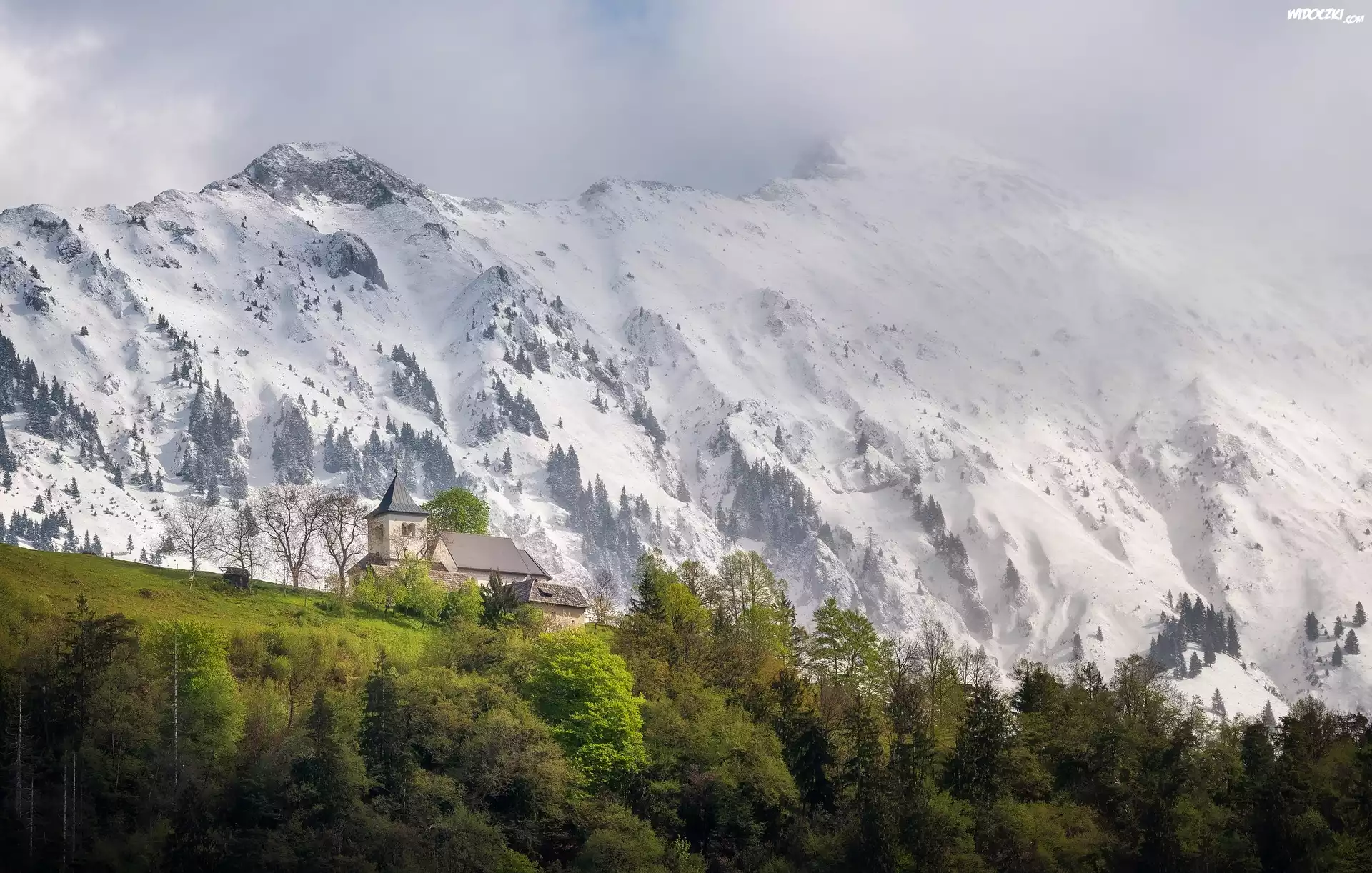 Zaśnieżone, Góry Karawanki, Ośnieżony, Szczyt Begunjscica, Śnieg, Kościół św. Piotra, Drzewa, Begunje na Gorenjskem, Słowenia |