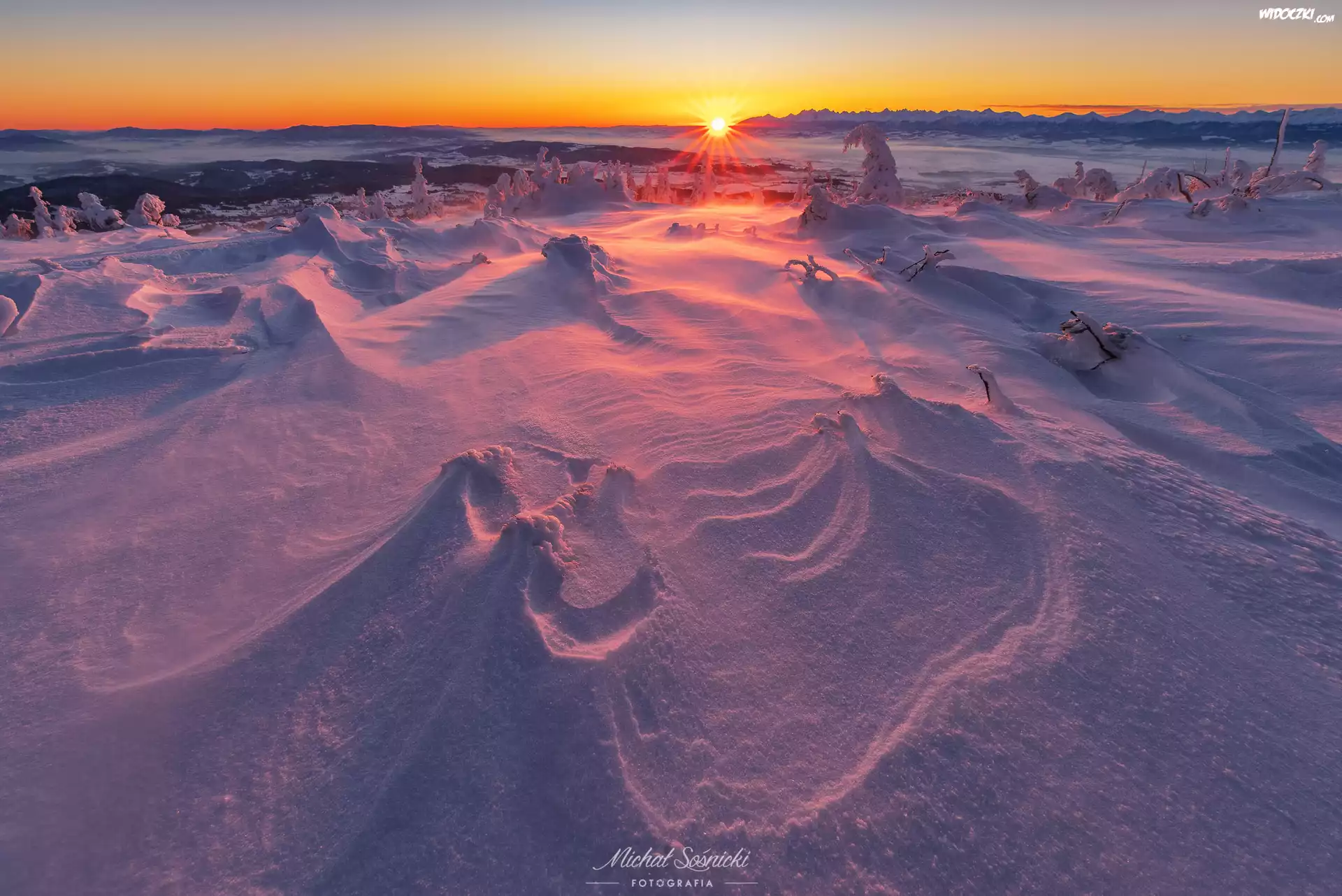 Polska, Zawoja, Babiogórski Park Narodowy, Wschód słońca, Ośnieżone, Drzewa, Zaspy, Zima, Śnieg |