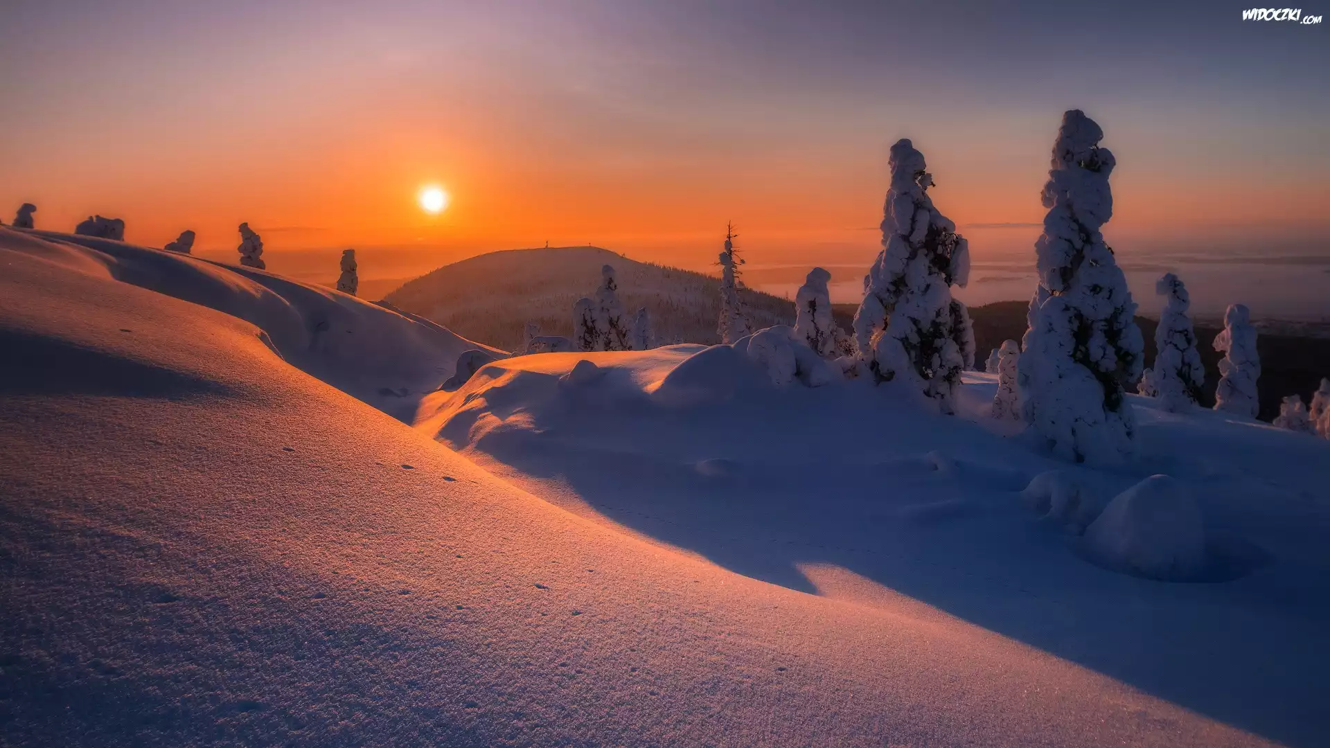 Zima, Śnieg, Drzewa, Zaspy, Zachód słońca, Góra