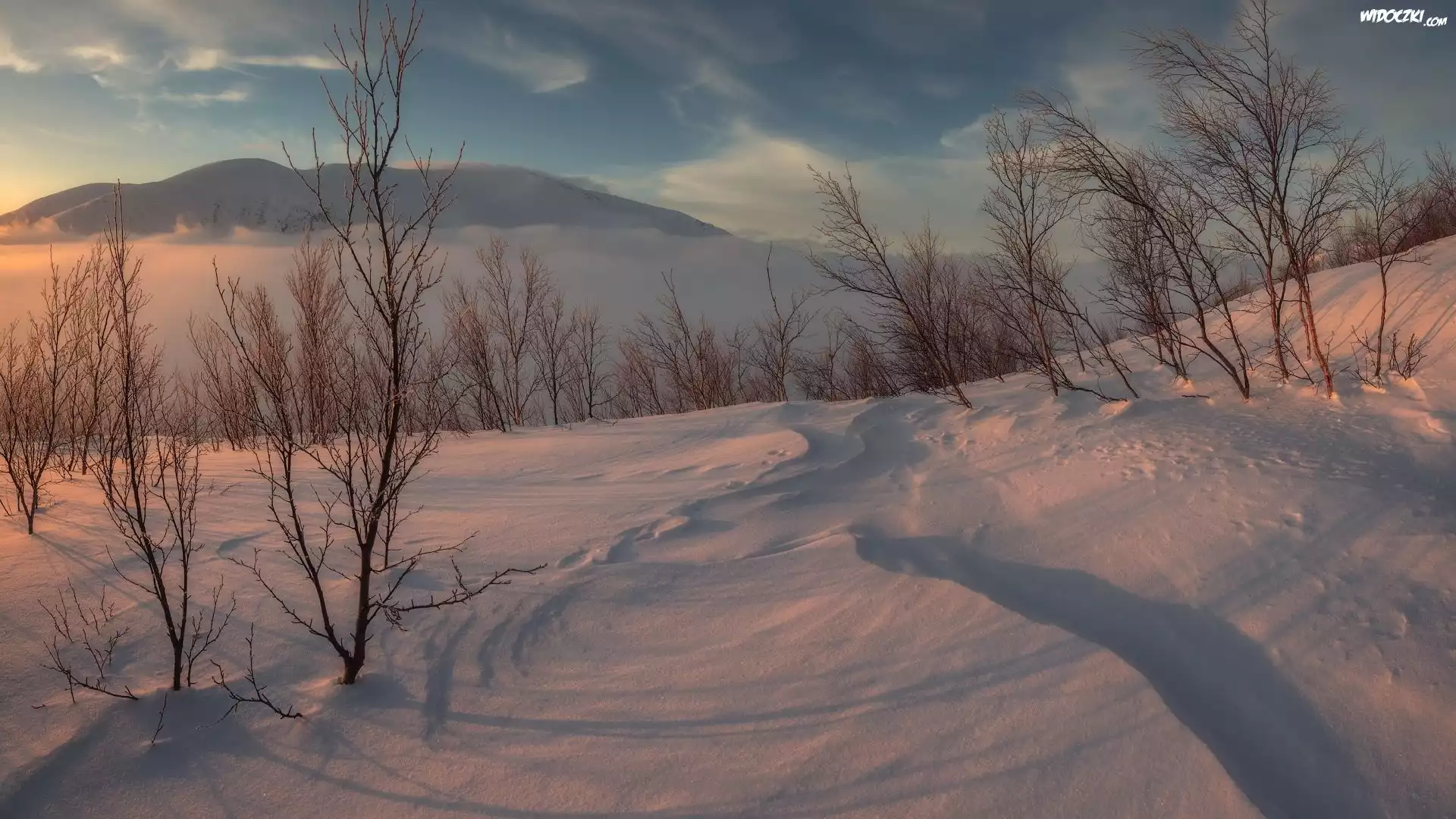 Zachód słońca, Góra, Zima, Mgła, Drzewa, Śnieg, Zaspy