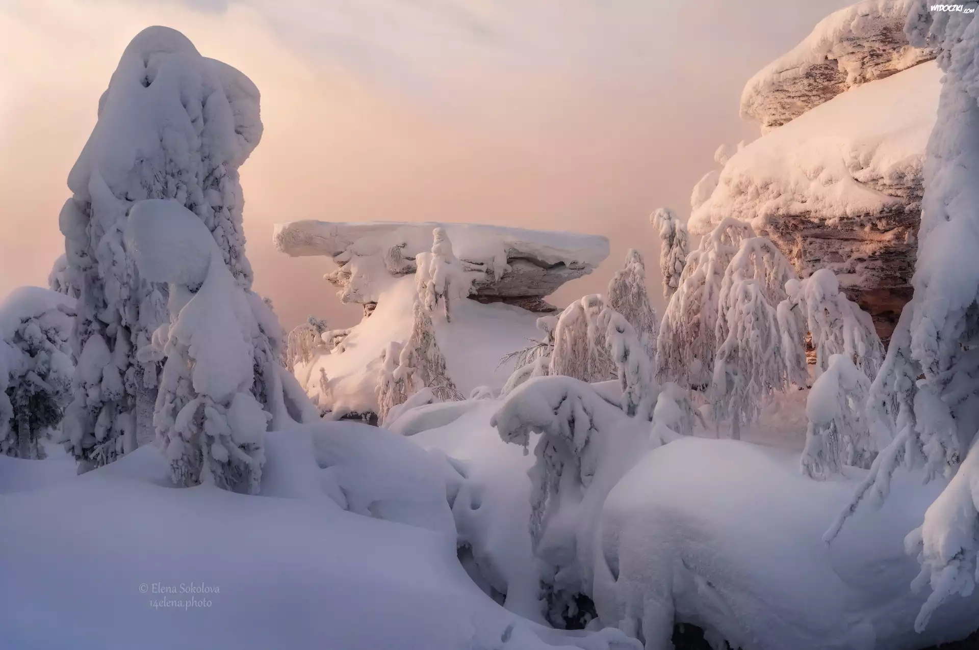 Zdjęcia, Zima, Ośnieżone, Drzewa, Zaspy, Śnieg, Skały