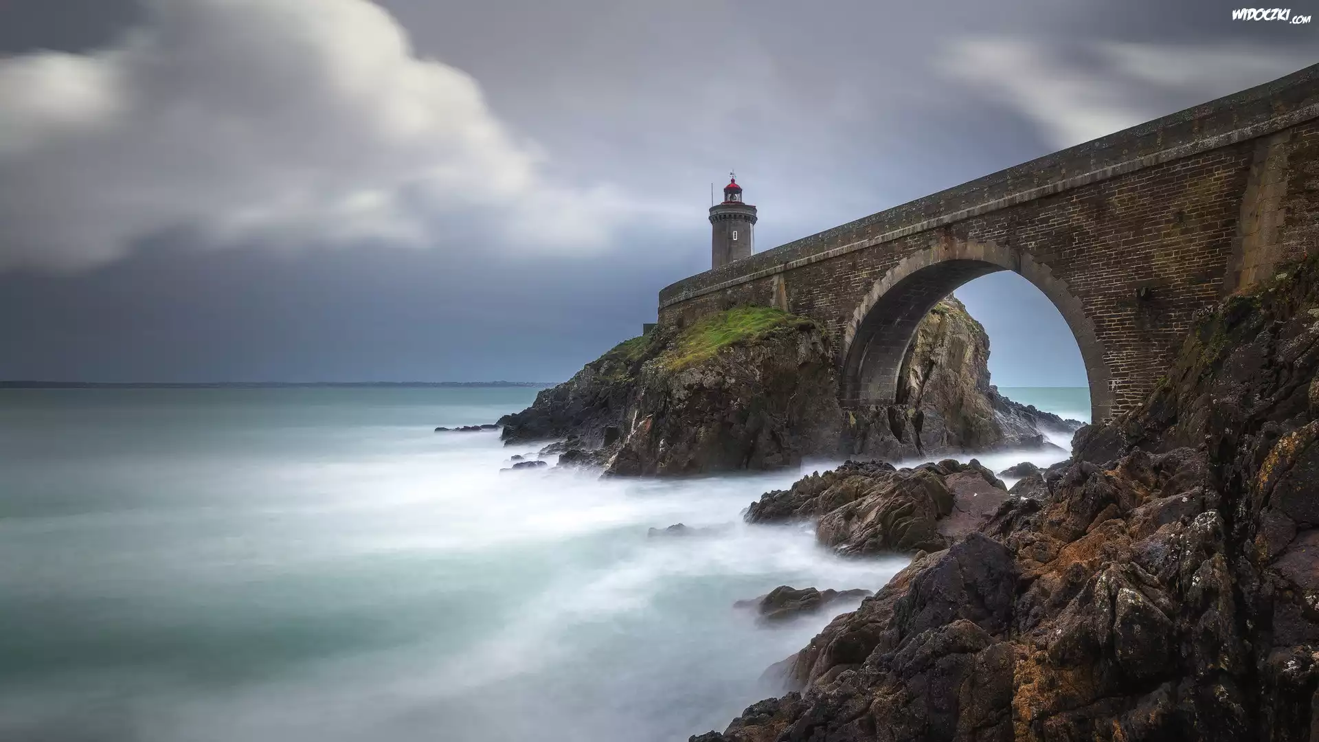 Zdjęcia, Francja, Bretania, Zatoka, Morze Celtyckie, Most, Latarnia morska Petit Minou, Skały