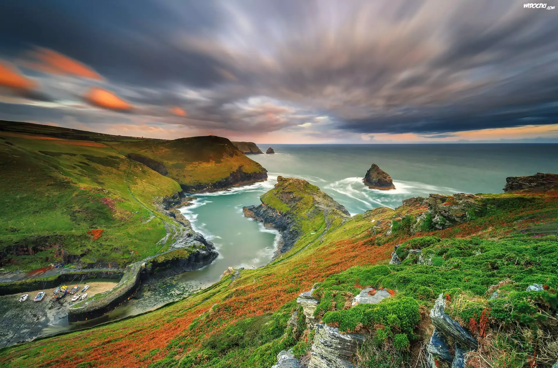 Zdjęcia, Morze, Zatoka, Wybrzeże, Skały, Trawa, Łodzie, Chmury