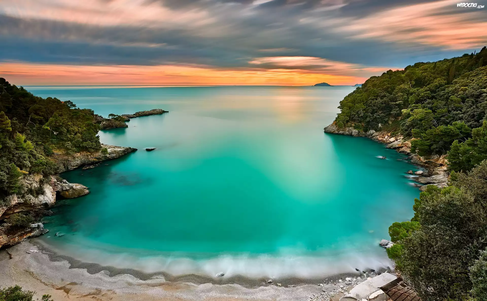 Zdjęcia, Morze, Zatoka, Plaża, Wybrzeże, Skały, Wschód słońca, Roślinność