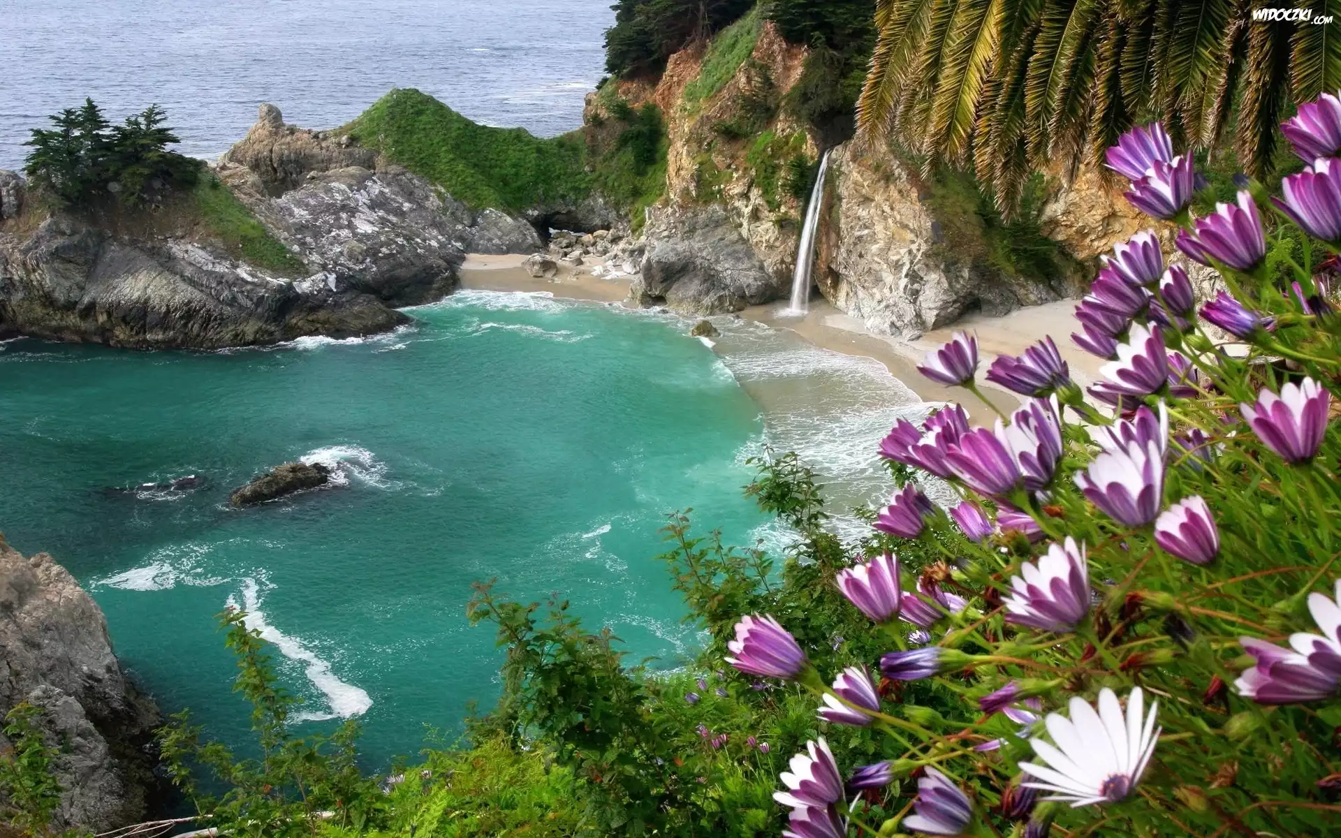 Zdjęcia, Zatoka, Wodospad, Skały, Kwiaty