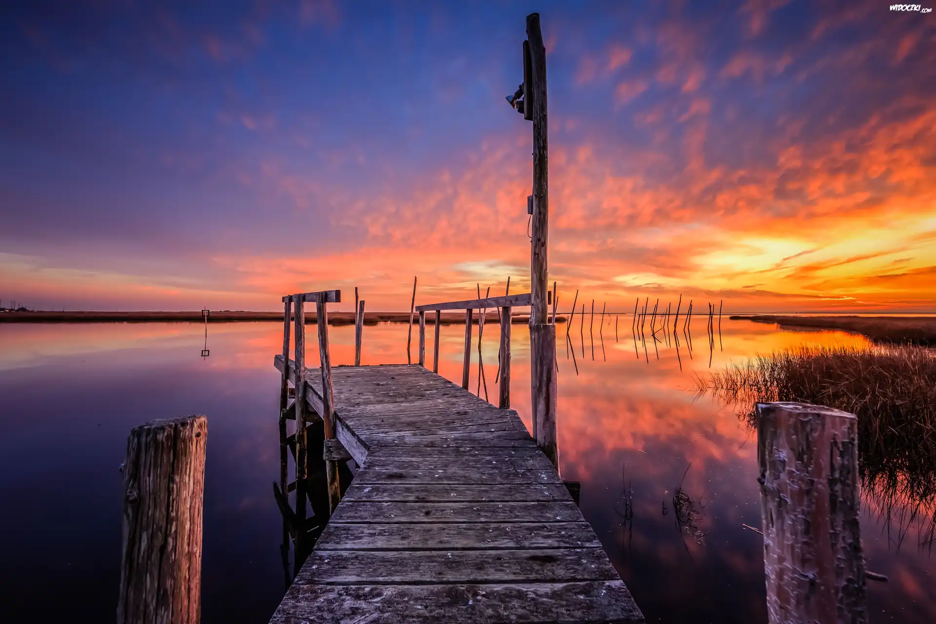Zdjęcia, Stany Zjednoczone, Stan New Jersey, Zatoka Great Bay, Jezioro, Pomost, Zachód słońca