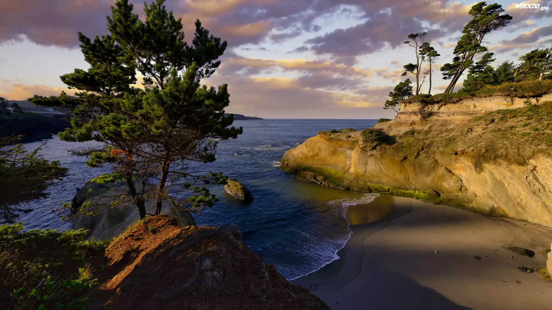 Morze, Skały, Wybrzeże, Zatoka, Drzewa, Poranek, Chmury