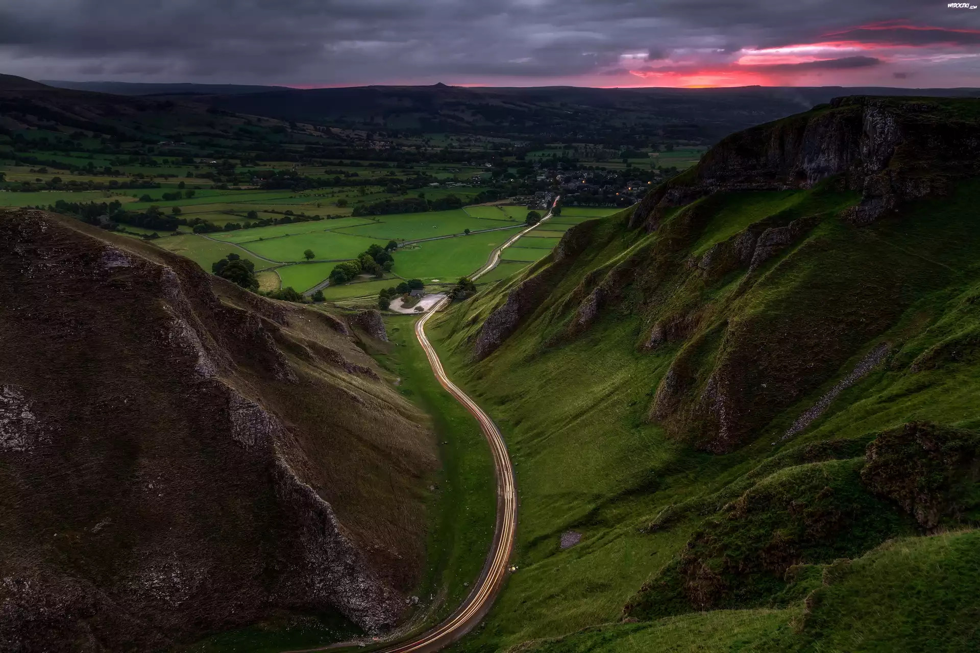 Zdjęcia, Góry, Zbocza, Droga, Pola, Skały, Zachód słońca