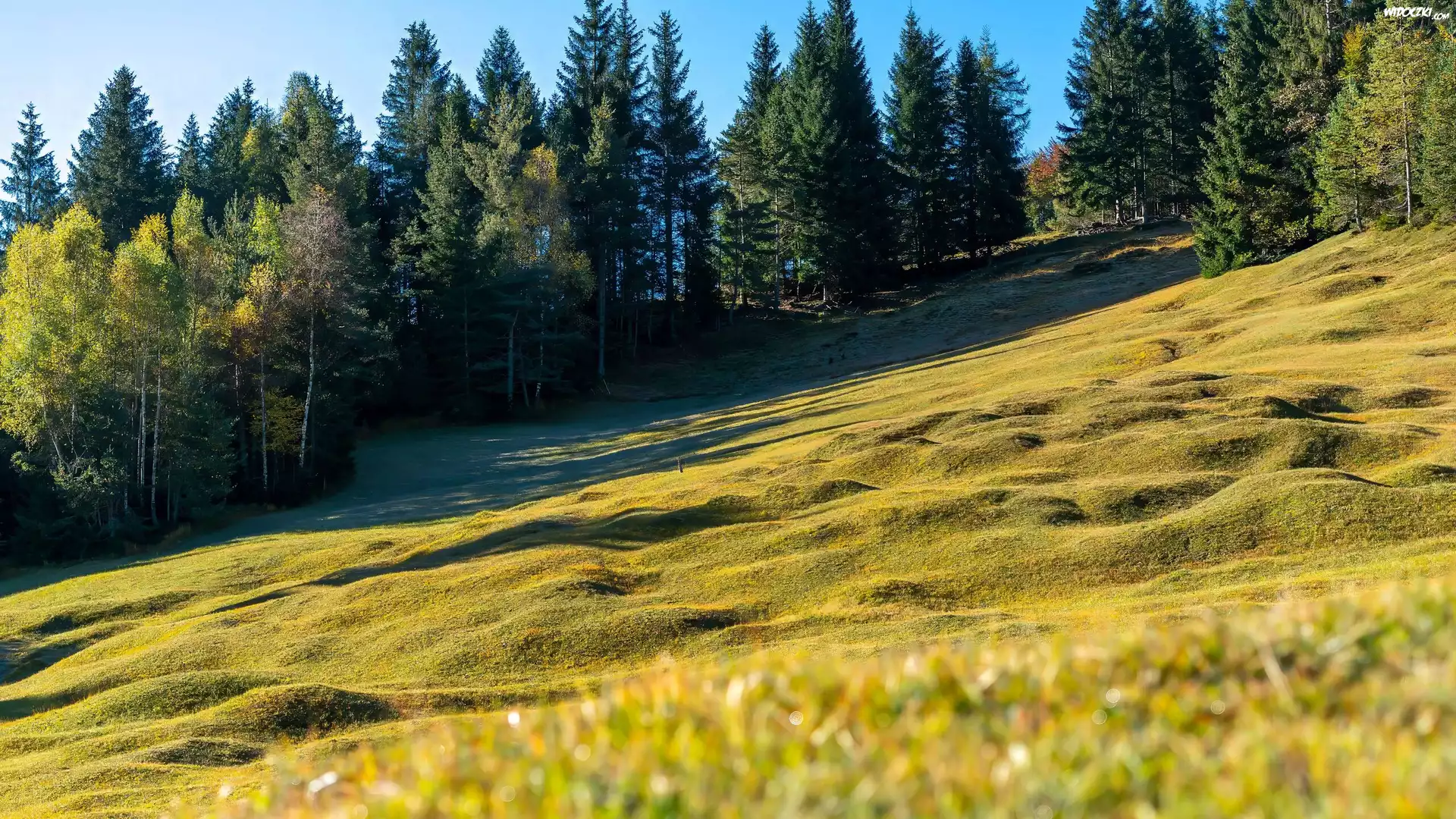 Zdjęcia, Łąka, Drzewa, Trawa, Zbocze