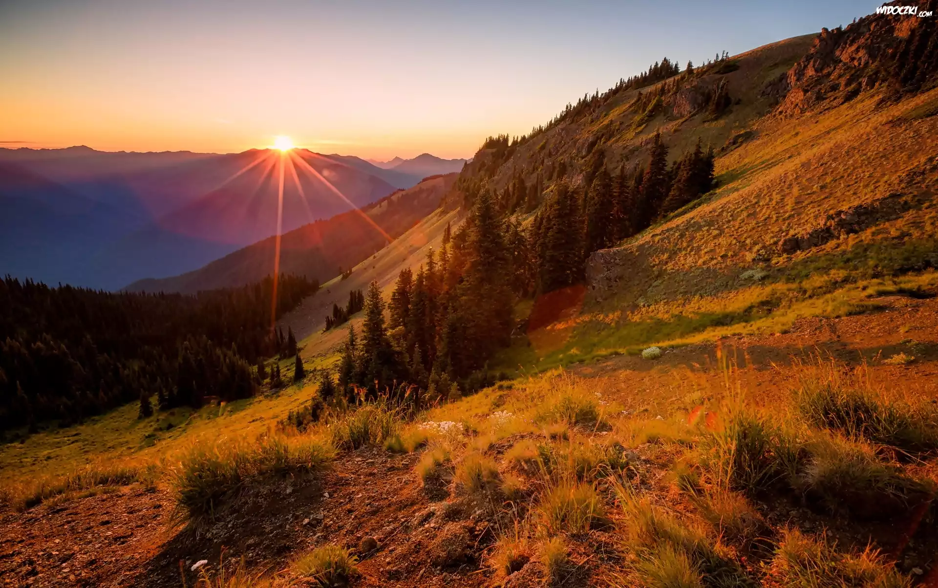 Zbocze, Góry, Lasy, Promienie, Słońca, Jesień
