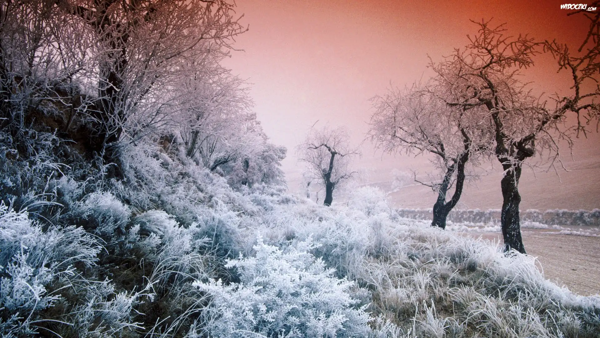 Zdjęcia, Zbocze, Krzewy, Drzewa, Szron, Droga