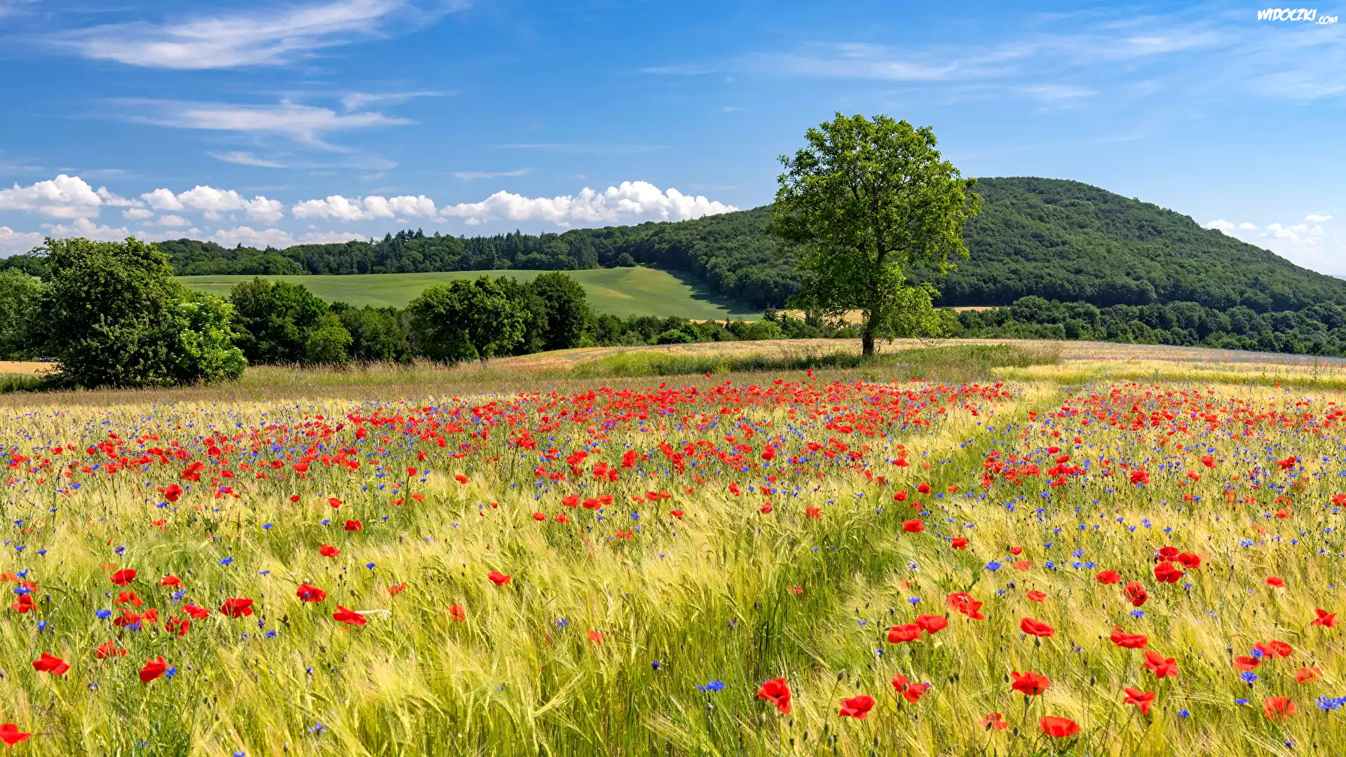 Zdjęcia, Wzgórza, Drzewa, Pola, Zboże, Maki, Lato