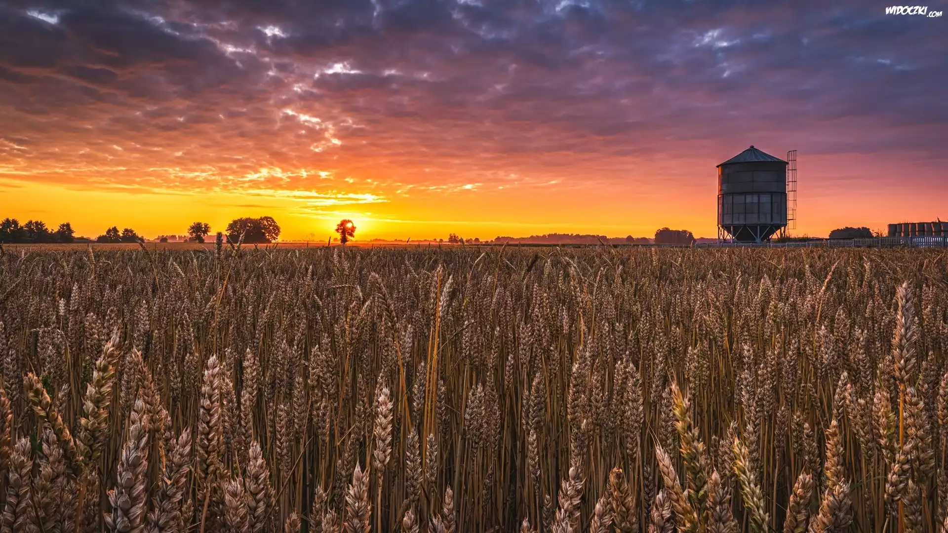 Zdjęcia, Pole, Zboże, Drzewa, Zachód słońca, Chmury, Silos