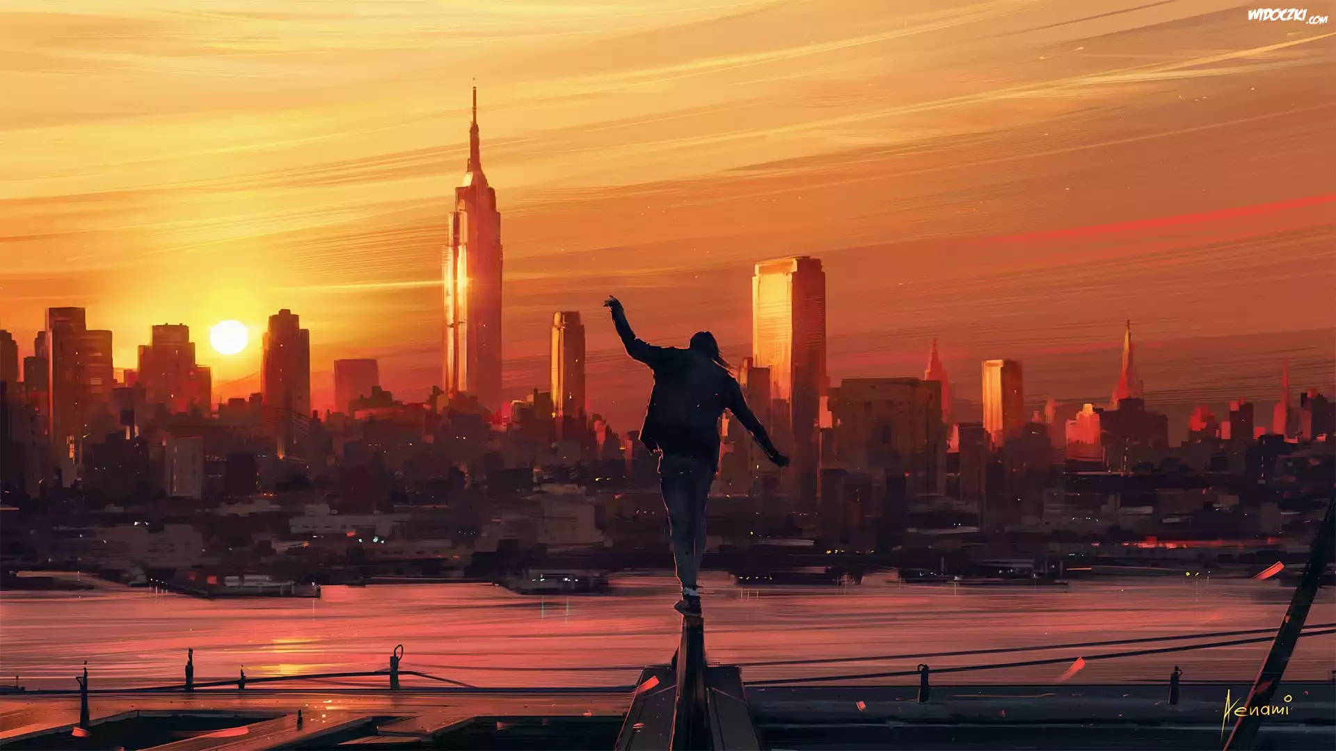 Zdjęcia, Zdjęcia miasta, Wieżowce, Zachód słońca, Chłopak