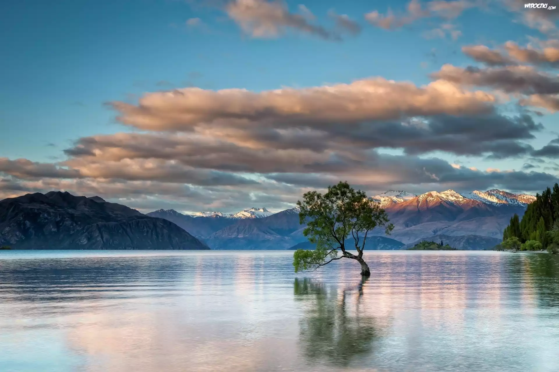 Nowa Zelandia, Jezioro Wanaka, Góry, Drzewo, Chmury