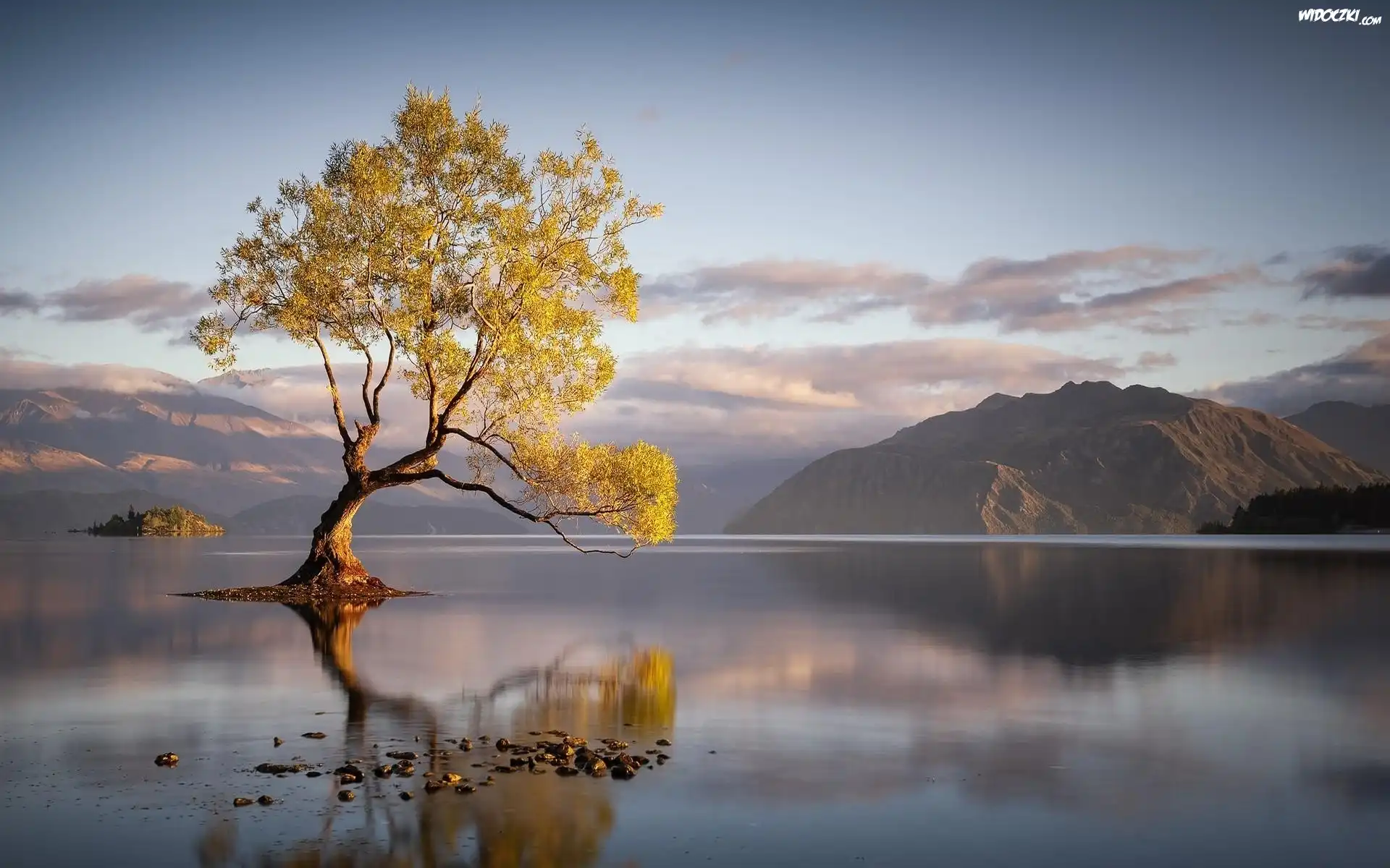 Nowa Zelandia, Jezioro Wanaka, Góry, Drzewo, Odbicie
