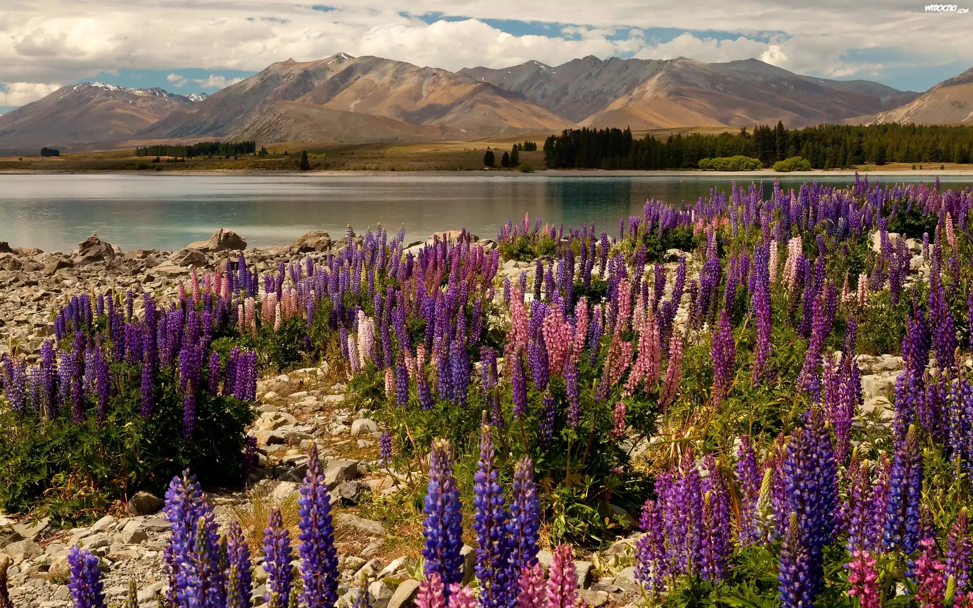 Zdjęcia, Nowa Zelandia, Jezioro, Góry, Brzeg, Kwiaty, Łubin