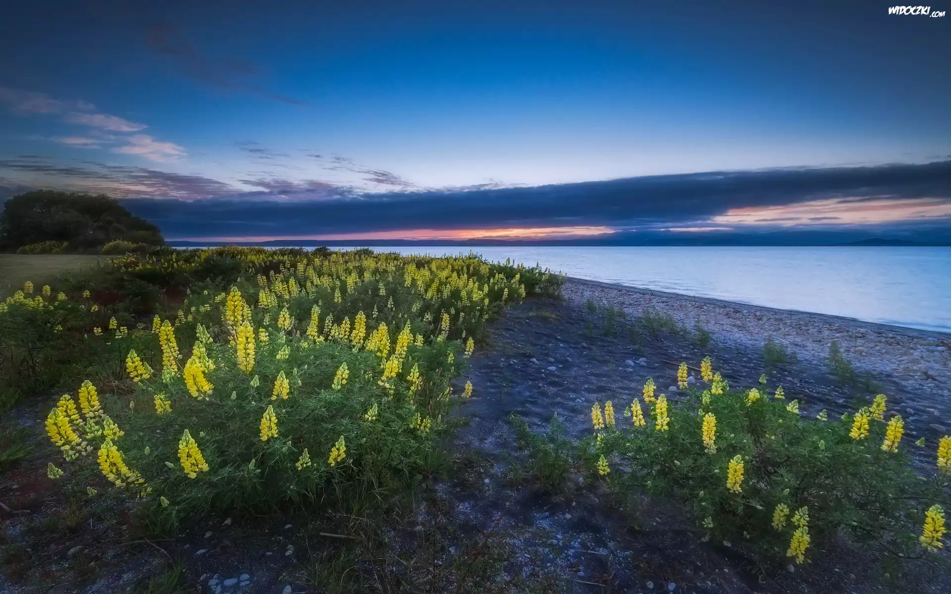 Zdjęcia, Nowa Zelandia, Jezioro, Taupo, Kwiaty, Żółty, Łubin